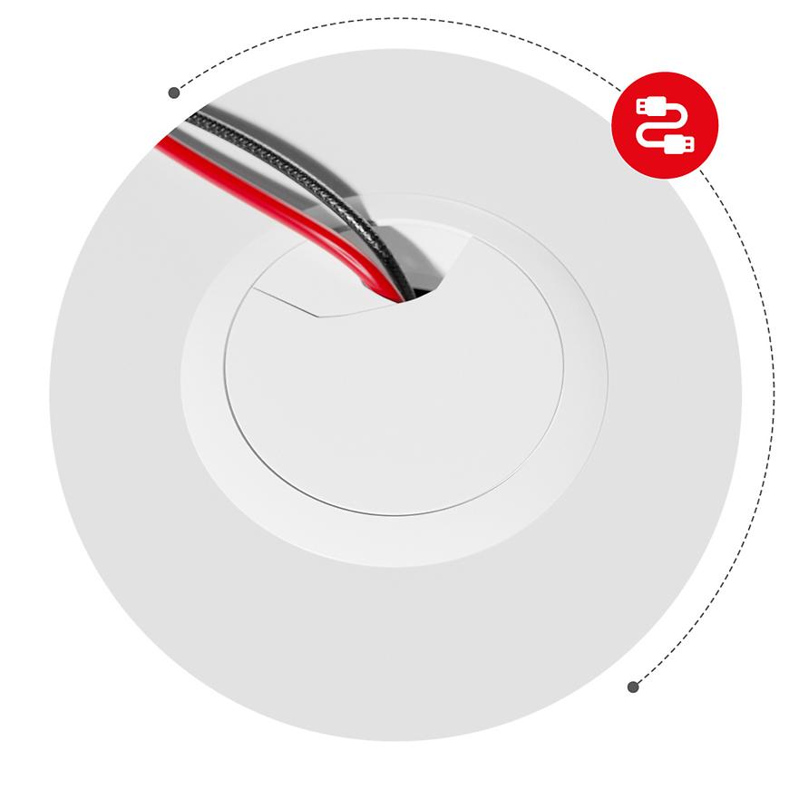 To biurko zostało zaprojektowane z myślą o funkcjonalności. Wyposażone w dwa funkcjonalne wloty na przewody, umieszczone po obu stronach blatu, ułatwiają prowadzenie i ukrywanie kabli, eliminując bałagan na blacie. Dzięki temu, organizacja przestrzeni staje się łatwiejsza, a stanowisko pracy wygląda schludnie.