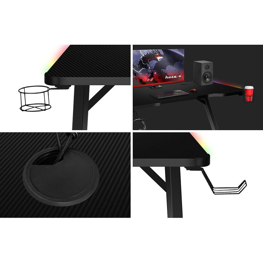 To biurko posiada również uchwyty na słuchawki i kubek, które pozwalają na praktyczne przechowywanie tych akcesoriów w zasięgu ręki. Dodatkowo, powłoka biurka pokryta wytrzymałym materiałem Carbon nie tylko prezentuje się efektownie, ale także jest odporna na uszkodzenia i łatwa do czyszczenia.