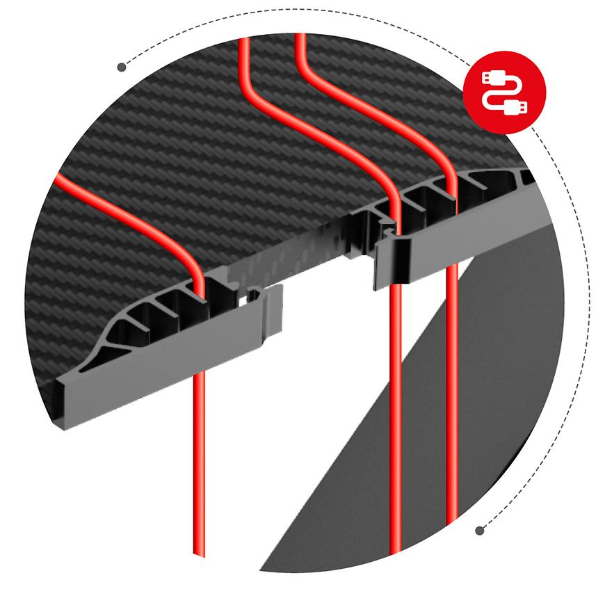 Stabilna rama biurka, wykonana z aluminium, gwarantuje solidność konstrukcji. Wzmocnione nogi dodatkowo wzmacniają stabilność i wytrzymałość, eliminując drgania podczas intensywnych ruchów podczas gry. To biurko jest niezawodne nawet w trakcie dynamicznych aktywności, zapewniając stabilną powierzchnię do pracy i rozgrywki.