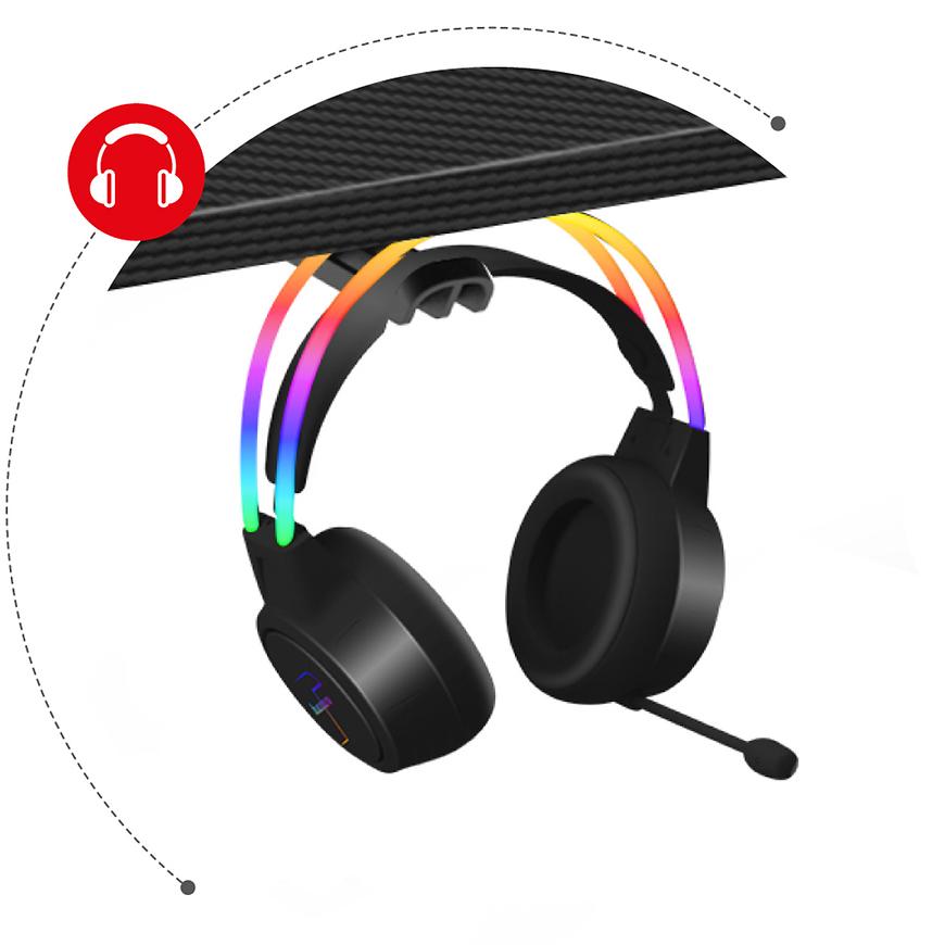 Biurko HZ-Hero 4.7 posiada również uchwyty na słuchawki i napoje, umieszczone w dogodnych miejscach. To praktyczne rozwiązanie pozwala na wygodne przechowywanie tych akcesoriów w zasięgu ręki, co dodatkowo uporządkuje przestrzeń na biurku.