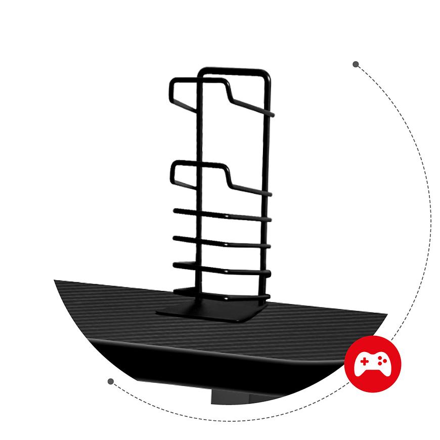 To biurko zostało zaprojektowane z myślą o funkcjonalności i organizacji. Uchwyty na słuchawki, kubek, pady, płyty i głośniki są symetrycznie rozmieszczone, co ułatwia przechowywanie tych akcesoriów w zasięgu ręki, a jednocześnie utrzymuje porządek na blacie.