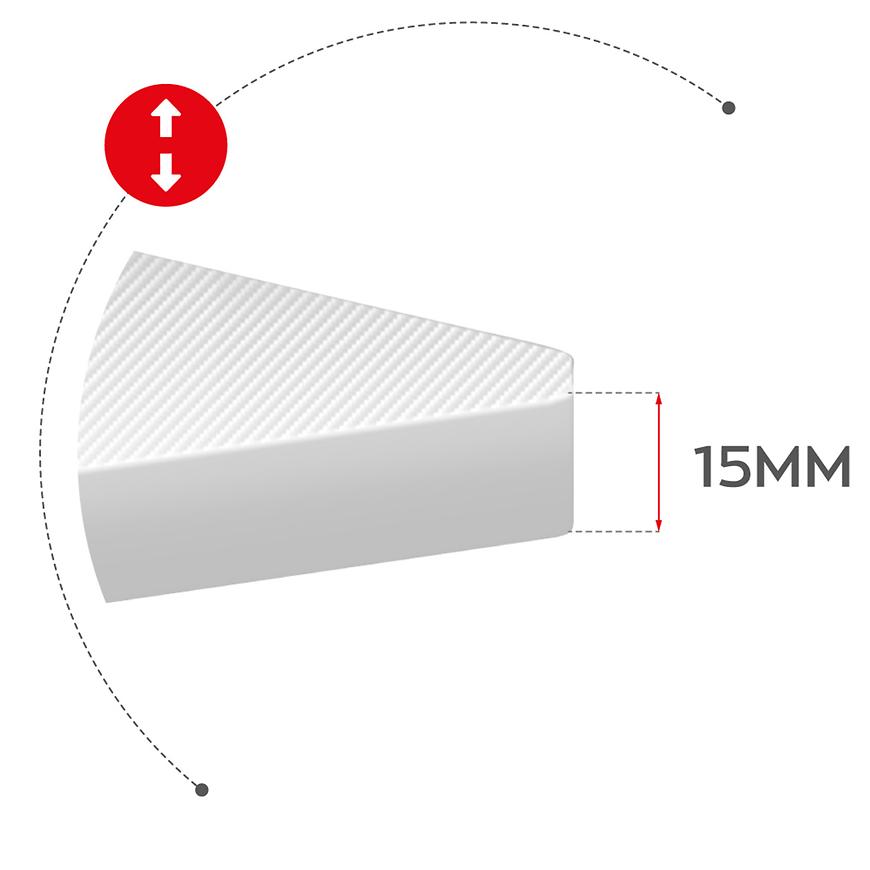 Powierzchnia biurka została pokryta wytrzymałym materiałem Carbon, co nie tylko dodaje mu elegancji, ale także zapewnia trwałość na długie lata. Gruby blat biurka z zaokrąglonymi krawędziami gwarantuje wygodne i bezpieczne użytkowanie.