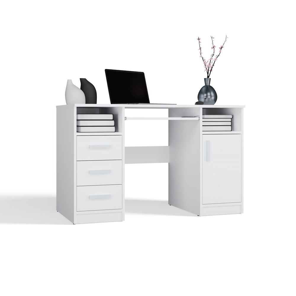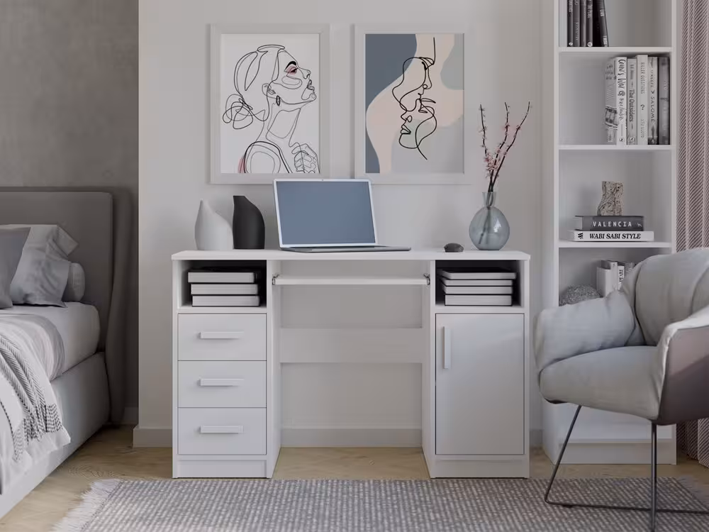 Biurko Gamma w kolorze białym to idealne połączenie nowoczesnego designu, funkcjonalności oraz wygody użytkowania, które sprawdzi się zarówno w domowym biurze, jak i pokoju młodzieżowym. Starannie dobrana kolorystyka nadaje wnętrzu elegancji i wyjątkowego charakteru, a przemyślana konstrukcja zapewnia komfortową organizację przestrzeni. Biurko wyposażone jest w trzy szuflady oraz zamykany schowek z drzwiami i dwiema półkami, co pozwala na wygodne przechowywanie dokumentów, książek czy akcesoriów biurowych.