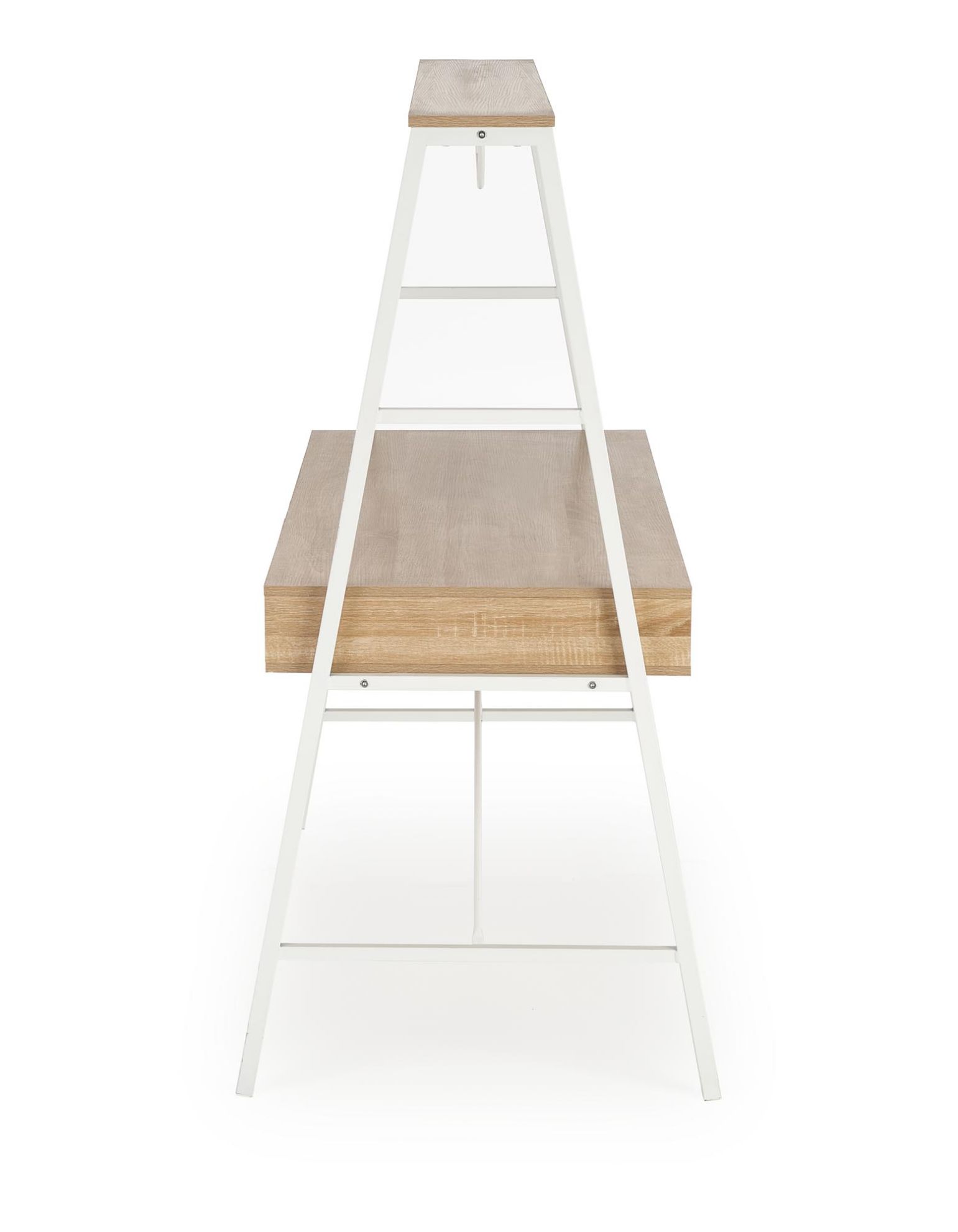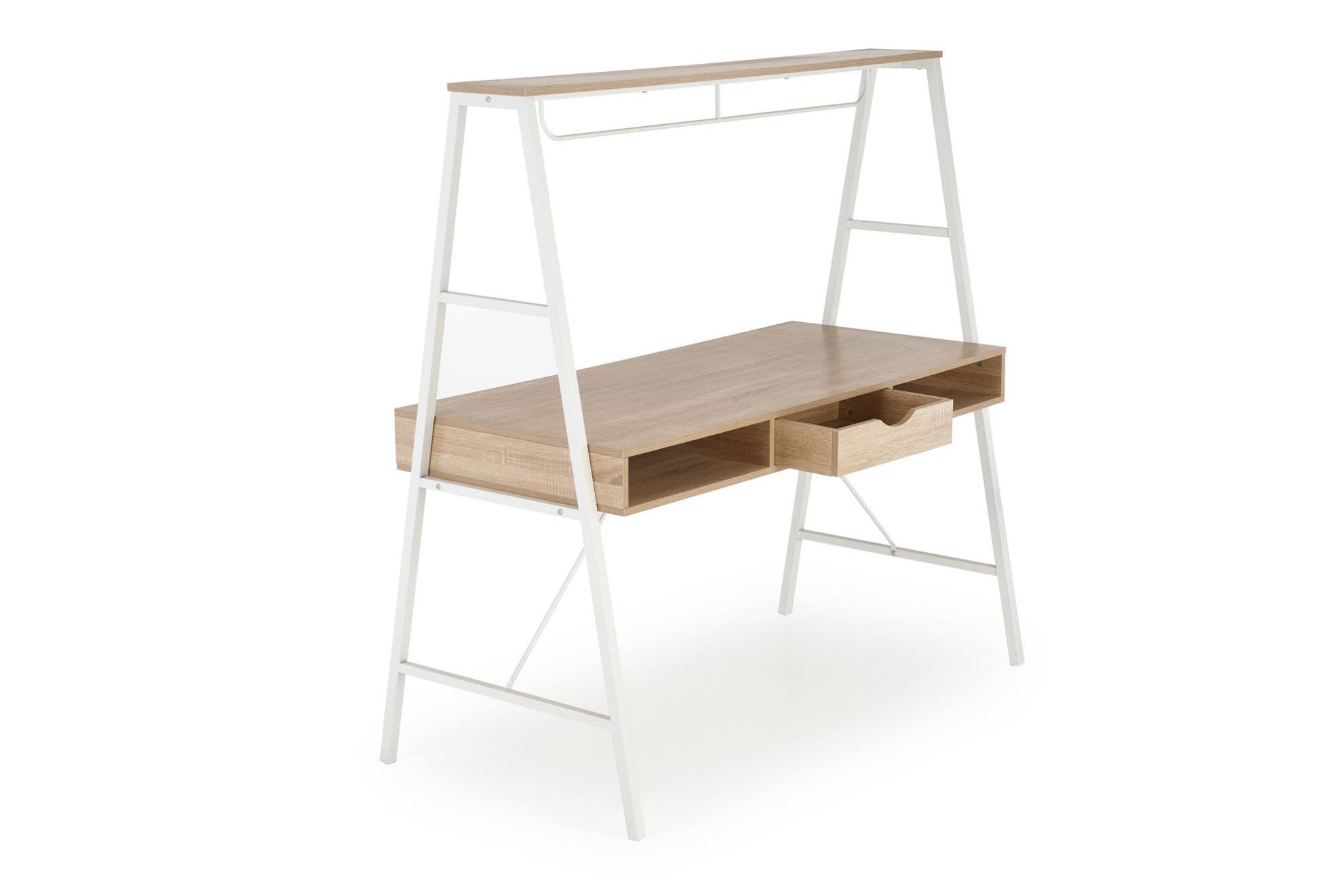 Konstrukcja biurka opiera się na solidnej stalowej ramie malowanej proszkowo w biłaym kolorze, co zapewnia stabilność i trwałość mebla. Stalowa konstrukcja jest odporna na uszkodzenia i przeciwdziała odkształceniom, co sprawia, że biurko utrzymuje swoją formę przez wiele lat.