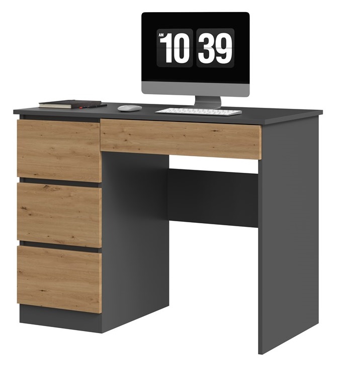 Meble zostały wykonane z płyty wiórowej laminowanej w kolorze antracyt/dąb artisan. Dzięki swojej klasycznej kolorystyce, będą pasowały do każdego wnętrza. Nowoczesny styl mebli wpadnie do gustu każdemu, kto poszukuje eleganckiego, klasycznego umeblowania. Orientacja biurka: lewa.