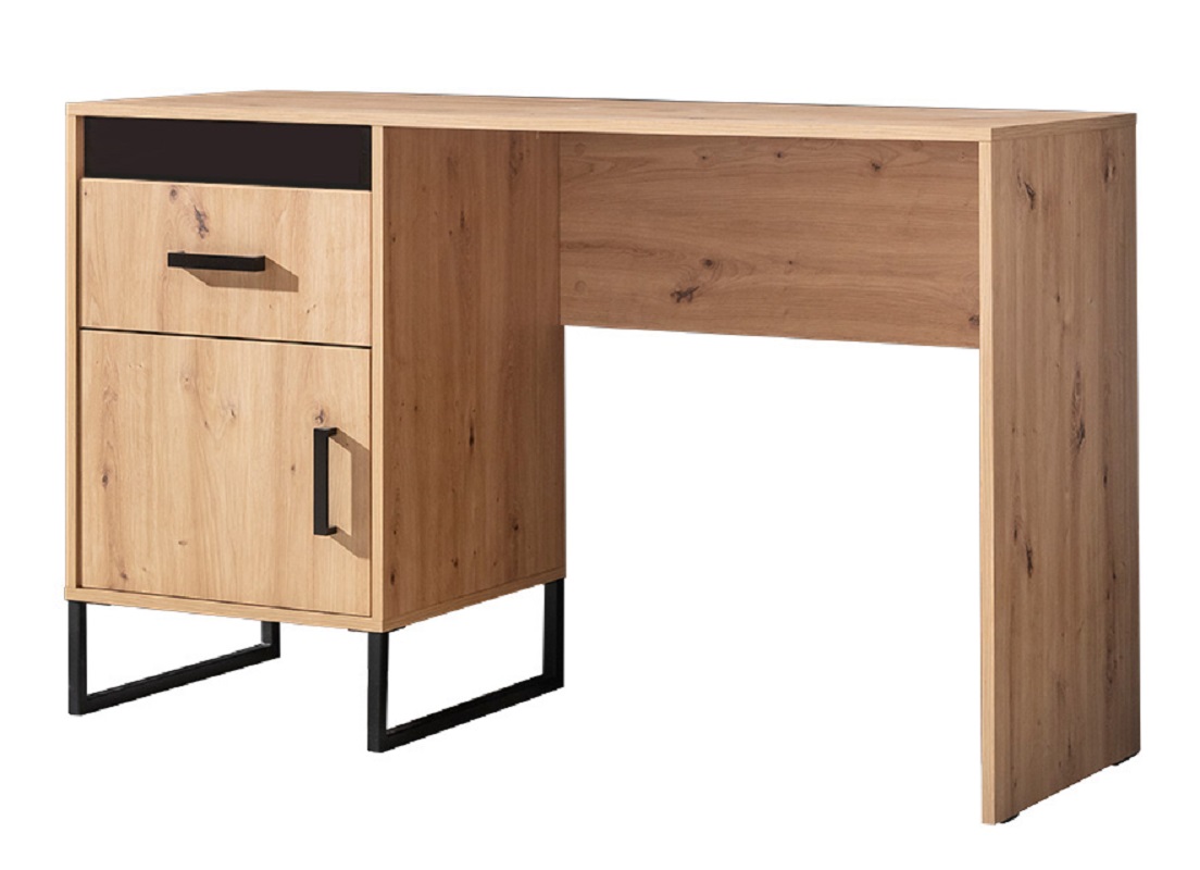 Jednodrzwiowa konstrukcja biurka Lamos 9 zapewnia wystarczającą przestrzeń do przechowywania niezbędnych rzeczy, a nad drzwiczkami znajduje się wygodna szuflada, ułatwiająca organizację drobnych przedmiotów. Metalowy uchwyt w kolorze czarnym dodaje elegancji i nowoczesności całej kompozycji.