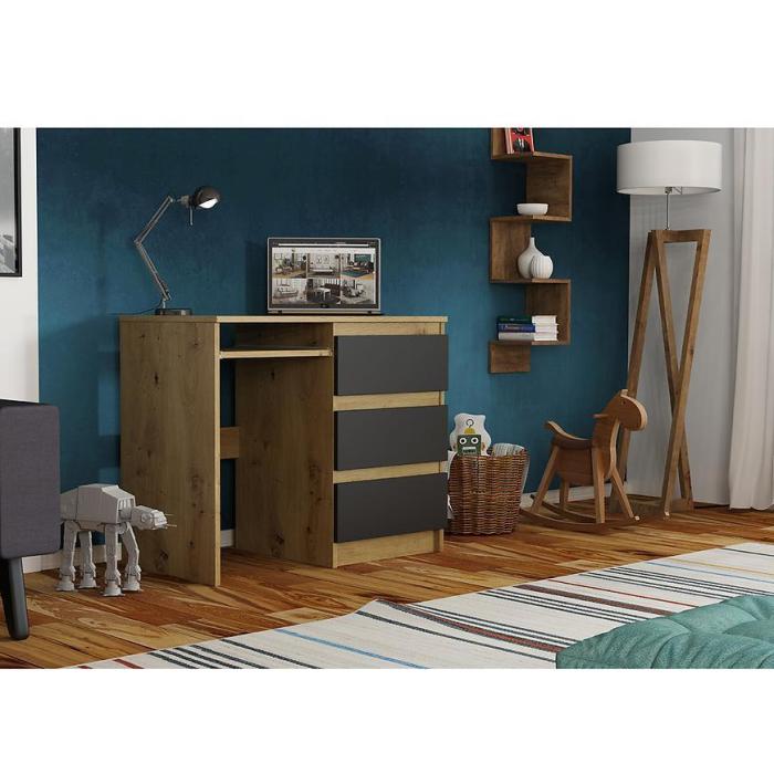 Biurko ma wymiary 90 cm szerokości, 50 cm głębokości i 75 cm wysokości, co zapewnia komfort pracy przy komputerze, laptopie lub przy tradycyjnych notatkach. Szeroki blat daje możliwość ustawienia monitora, laptopa, lampki biurkowej i innych akcesoriów. Dodatkowo biurko wyposażone jest w półkę na klawiaturę, co ułatwia organizację przestrzeni i wygodne korzystanie z komputera.