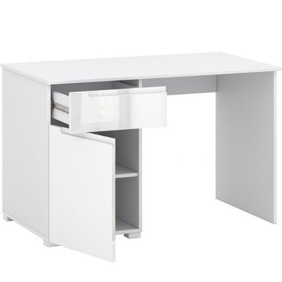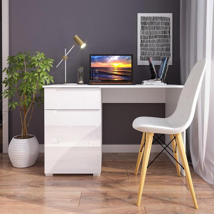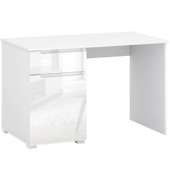 Biurko Hill biały połysk to propozycja dla osób poszukujących praktycznego i stylowego biurka do pracy, nauki lub codziennych obowiązków biurowych. Jasne wykończenie w połysku sprawia, że biurko optycznie powiększa przestrzeń i wprowadza do wnętrza nowoczesny charakter.