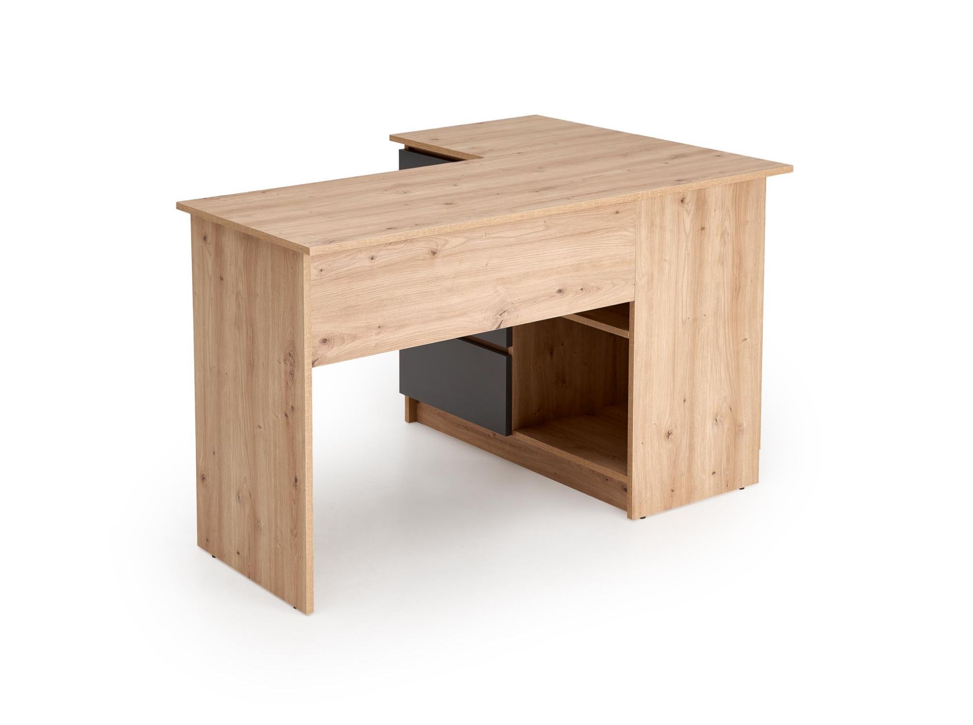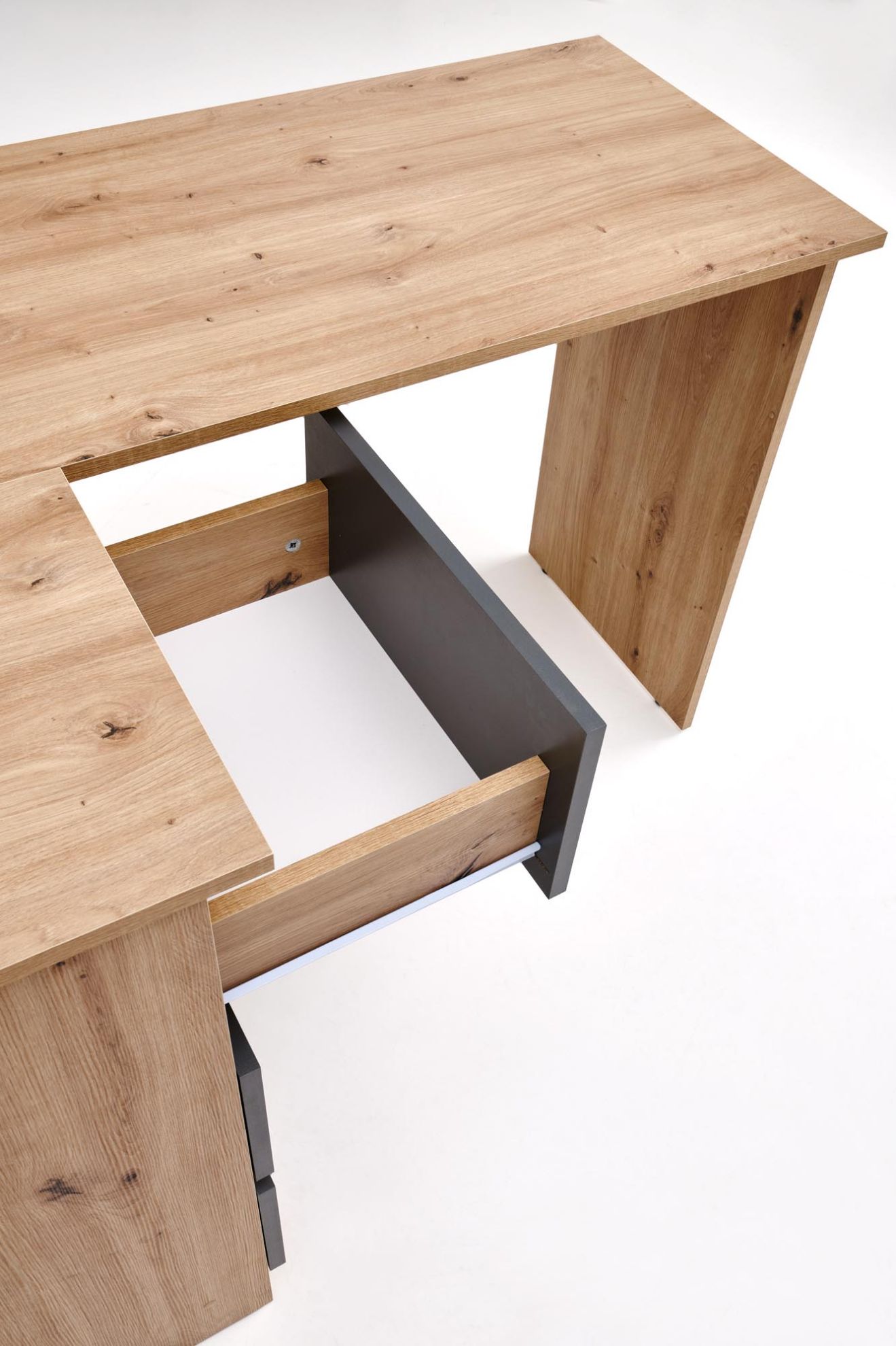Połączenie dębu artisan z grafitowym stelażem sprawia, że biurko Linea jest uniwersalne i pasuje do wielu aranżacji – od klasycznych po bardziej nowoczesne. To mebel wygodny, trwały i estetyczny, który ułatwia codzienną pracę, naukę i organizację przestrzeni.