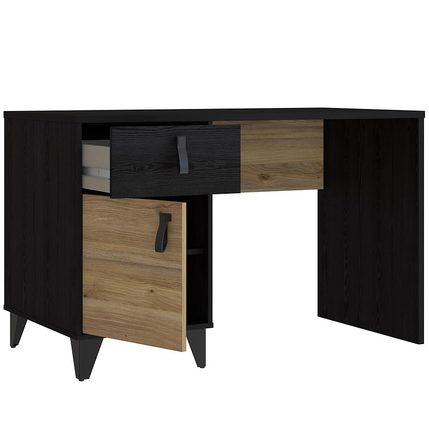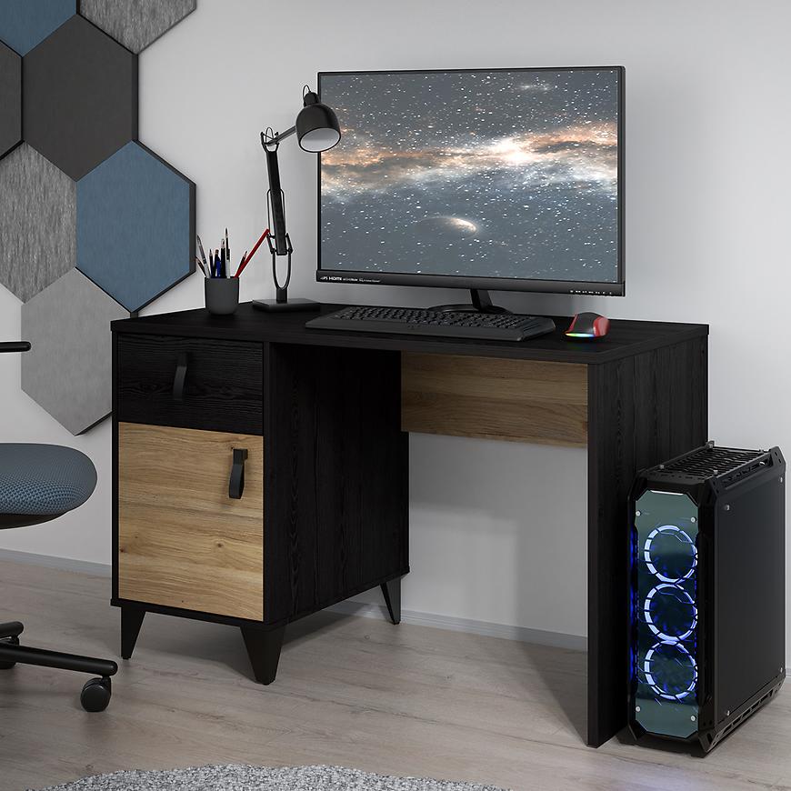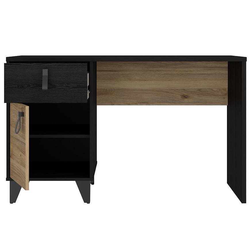 Biurko posiada jedna otwieraną szafkę i jedną szufladę, co pozwala na wygodne przechowywanie różnych materiałów biurowych i akcesoriów. Orientacja lewa umożliwia dostosowanie biurka do Twoich preferencji i indywidualnych potrzeb.