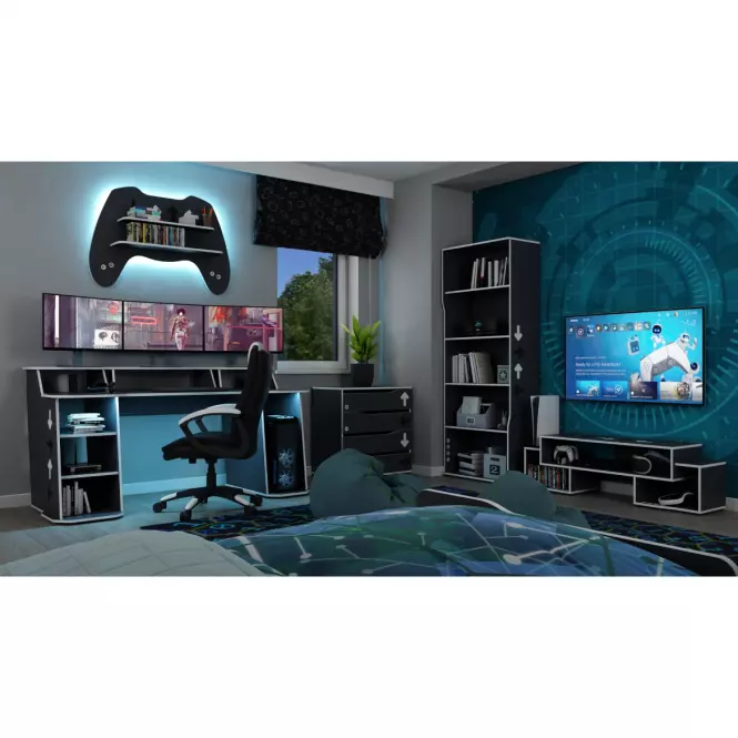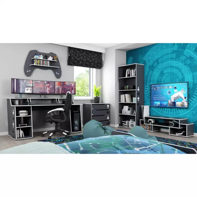 Kolorystyka biurka, utrzymana w tonacji grafitu i bieli, nadaje mu nowoczesny i minimalistyczny wygląd, który będzie doskonale współgrał zarówno z jasnymi, jak i ciemnymi wnętrzami. Matowe wykończenie frontów i korpusu podkreśla elegancki charakter mebla, a zastosowanie wysokiej jakości laminowanej płyty wiórowej zapewnia trwałość oraz odporność na codzienne użytkowanie. Biurko Matrix to nie tylko funkcjonalny element wyposażenia, ale także dekoracyjny akcent, który podkreśli nowoczesny styl wnętrza.