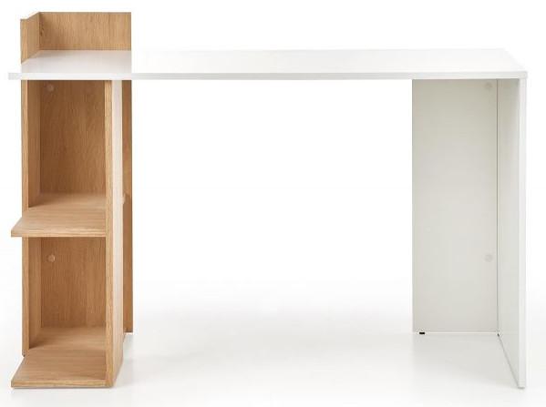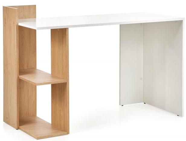 Nowoczesność i funkcjonalność - tak w skrócie można opisać biurko Miko. Miko to funkcjonalne biurko dla dziecka, które posiada duży blat roboczy, a z boku dwie pojemne półki na książki, zeszyty, czy też inne rzeczy. Biurko dziecięce wykonano z bardzo dobrej jakościowo laminowanej płyty meblowej - materiału łatwego w utrzymaniu w czystości. Prezentowany mebel posiada blat oraz jedną nogę w kolorze białym, natomiast elementy składające się na regał z półeczkami ma kolor złotego dębu. Połączenie modnej bieli i ciepłej barwy dębu sprawia, że biurko dla dzieci idealnie prezentować się będzie we wnętrzach nowoczesnych oraz tych urządzonych w stylu skandynawskim. Biurko Miko dla dzieci to wspaniałe rozwiązanie do niedużych pokoi. Dziecko bez problemu będzie mogło bawić się i uczyć przy biurku, a pod ręką będzie miało również dostęp do materiałów, czy też zabawek. Pielęgnacja: lekko wilgotna szmatka.