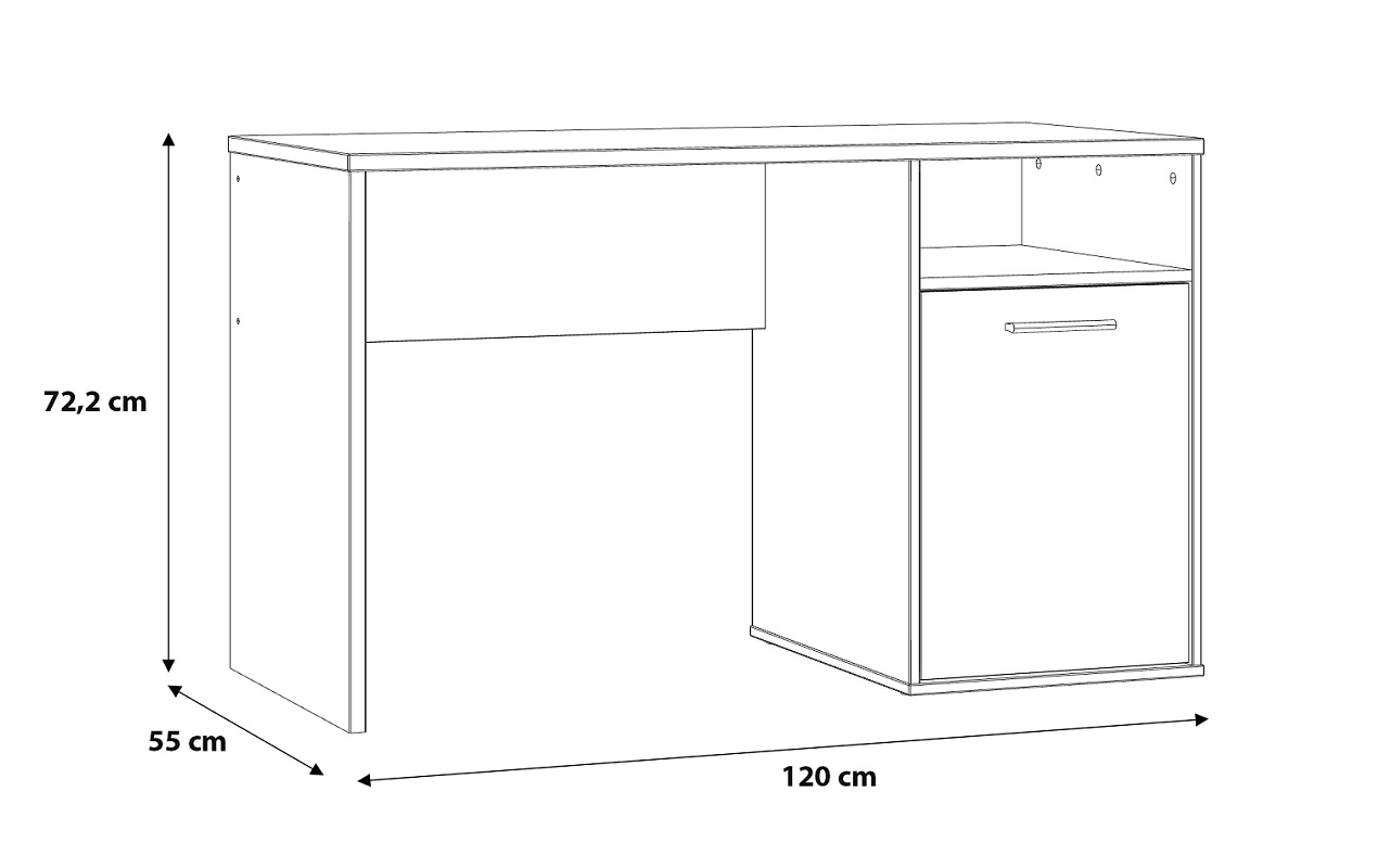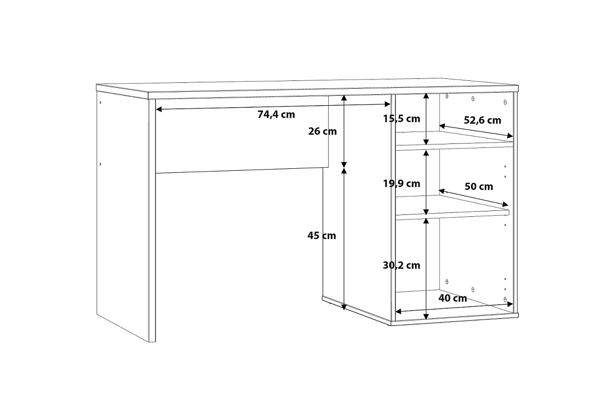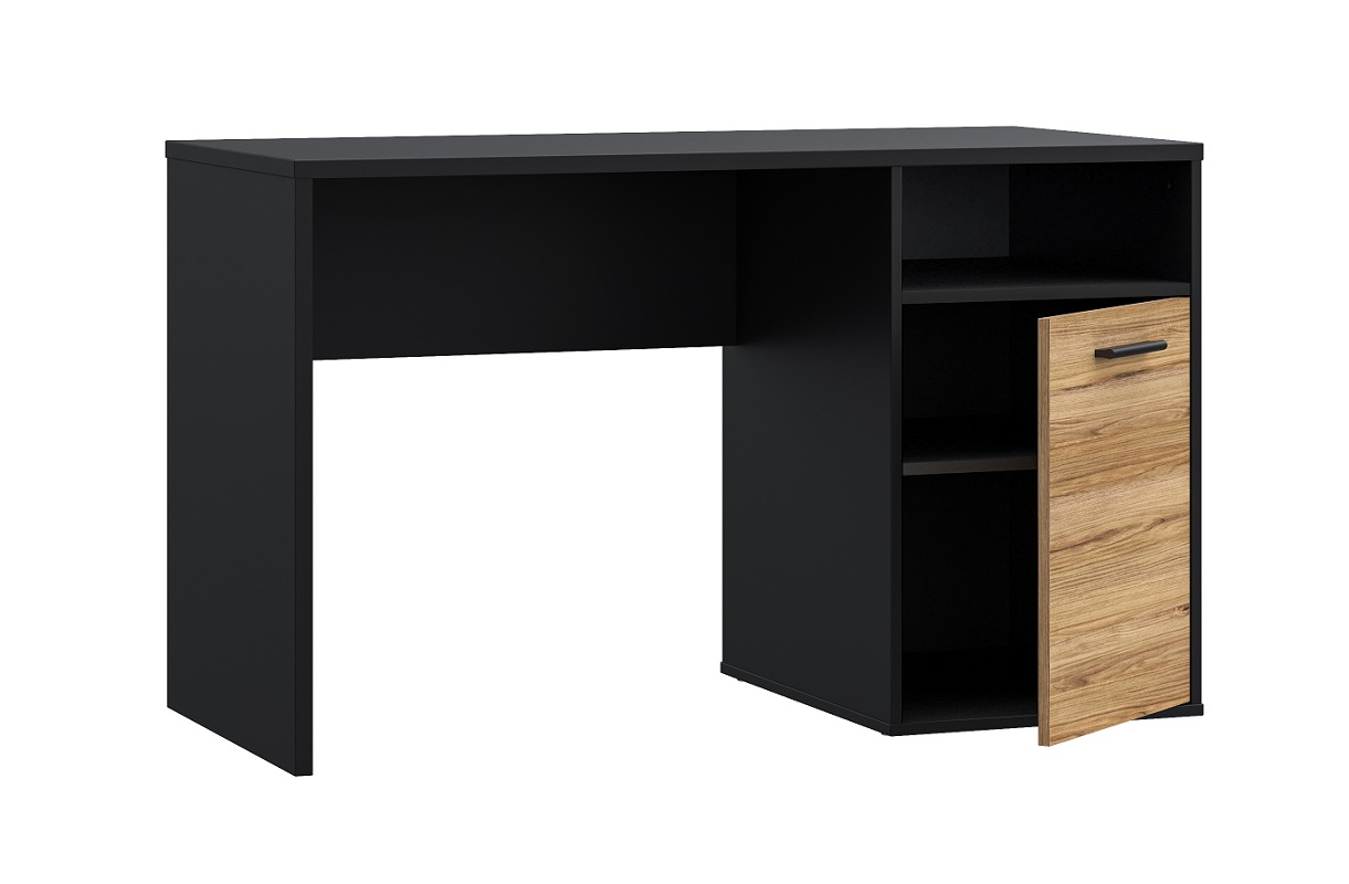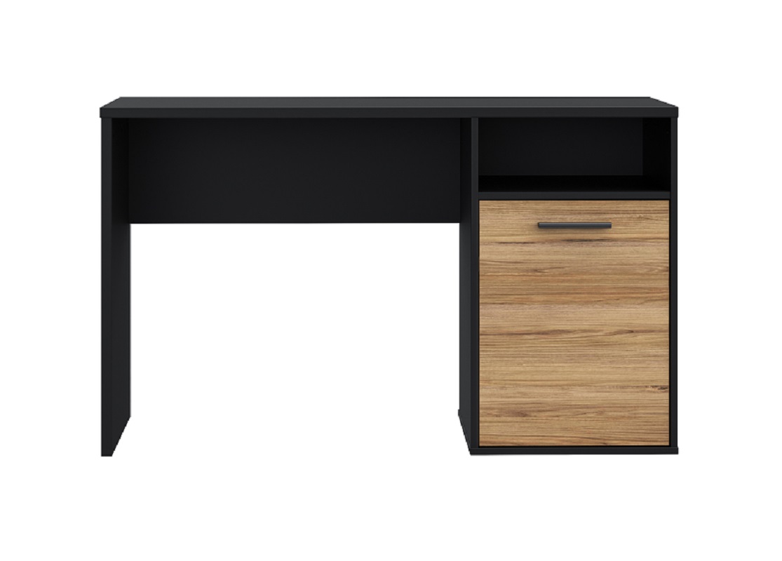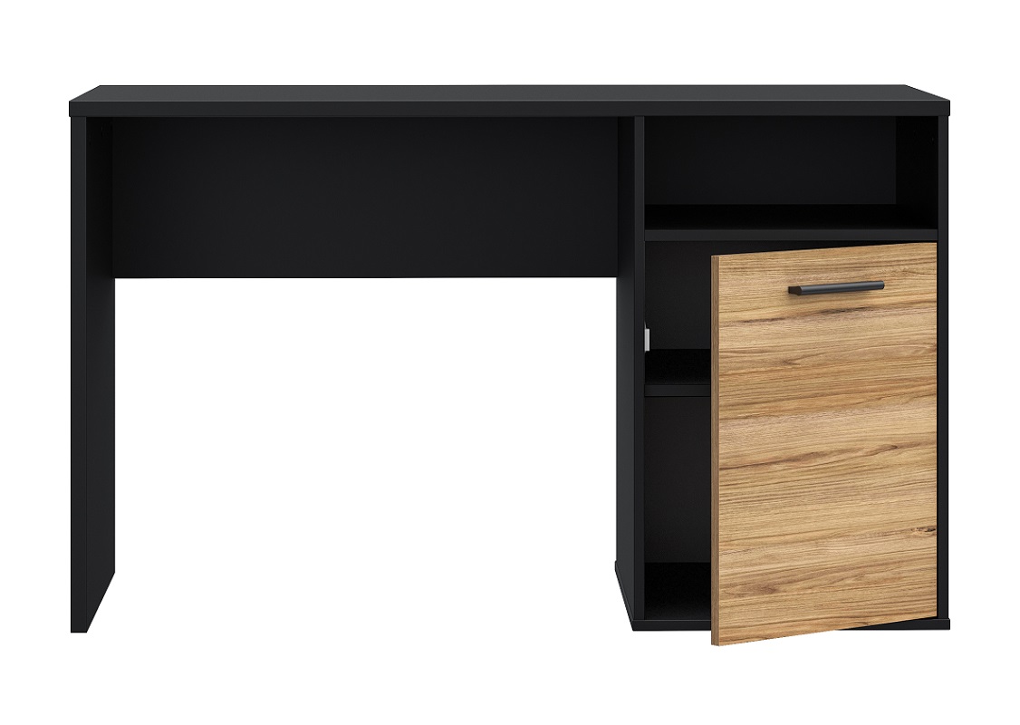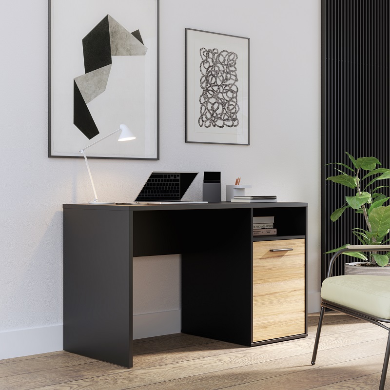 Biurko Mokkaro jednodrzwiowe z szufladą i półką. Korpus biurka w czarnym dekorze z frontami dąb catania. Uchwyty wykonane z tworzywa w kolorze czarnym. Produkt w paczkach do samodzielnego montażu.