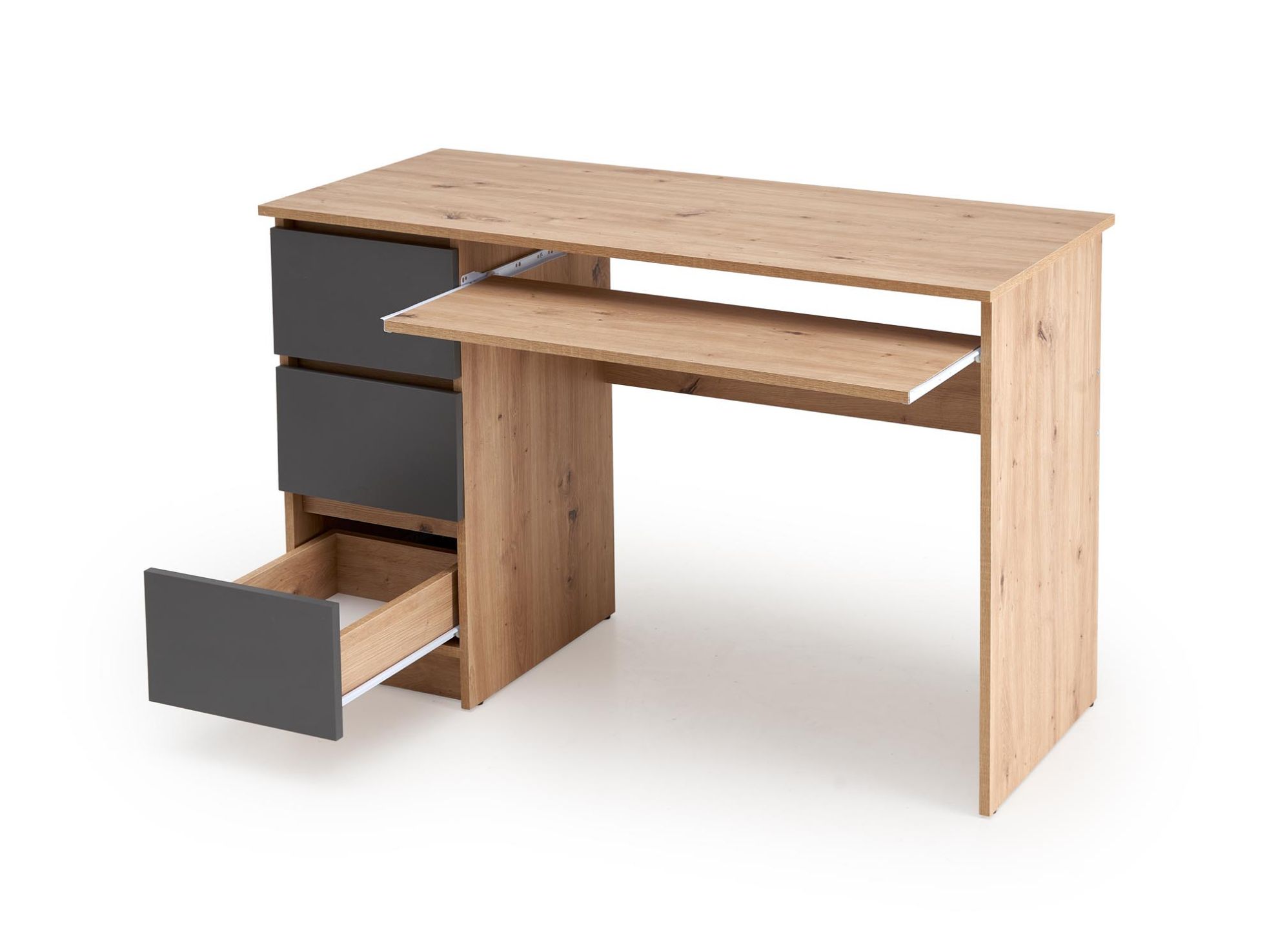 Blat o wymiarach 120 × 50 cm zapewnia komfortową powierzchnię do pracy przy komputerze, nauki czy organizowania dokumentów. Proporcje biurka sprawiają, że mebel dobrze pasuje nawet do węższych pomieszczeń, nie zajmując nadmiernie miejsca.