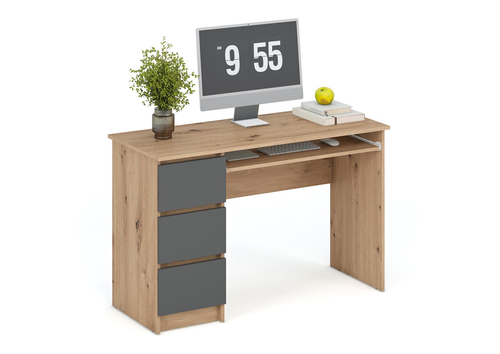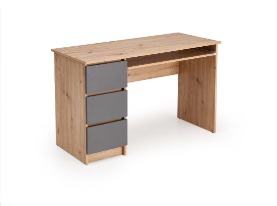 Biurko Nova w odcieniu dąb artisan z grafitowym stelażem łączy tradycyjny design z nowoczesnym kontrastem kolorów. Ciepły blat w naturalnym odcieniu drewna wprowadza przytulny akcent do wnętrza, a grafitowa podstawa nadaje meblowi wyrazisty, elegancki charakter. To biurko idealne do domowego gabinetu, pokoju młodzieżowego lub klasycznej przestrzeni biurowej.