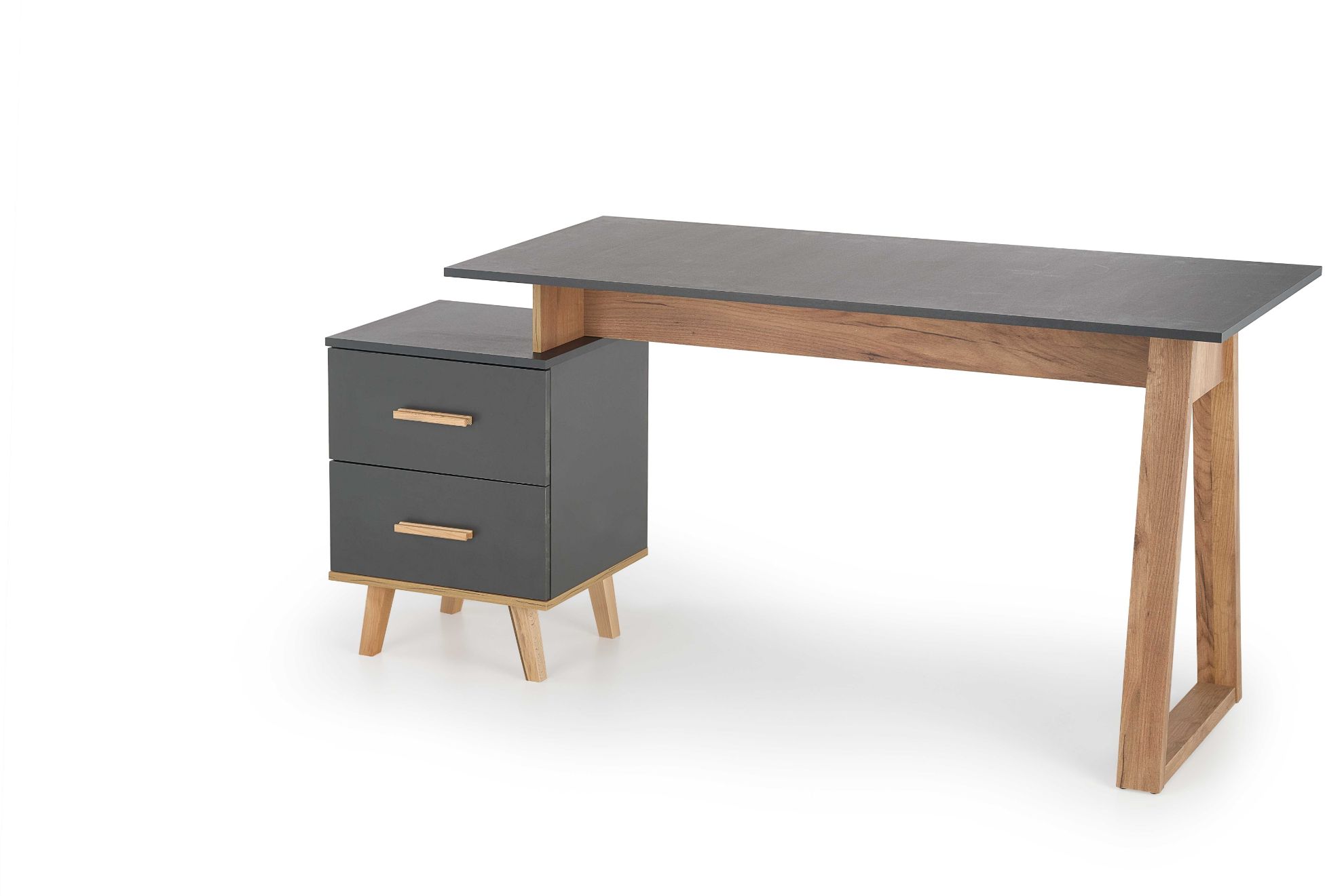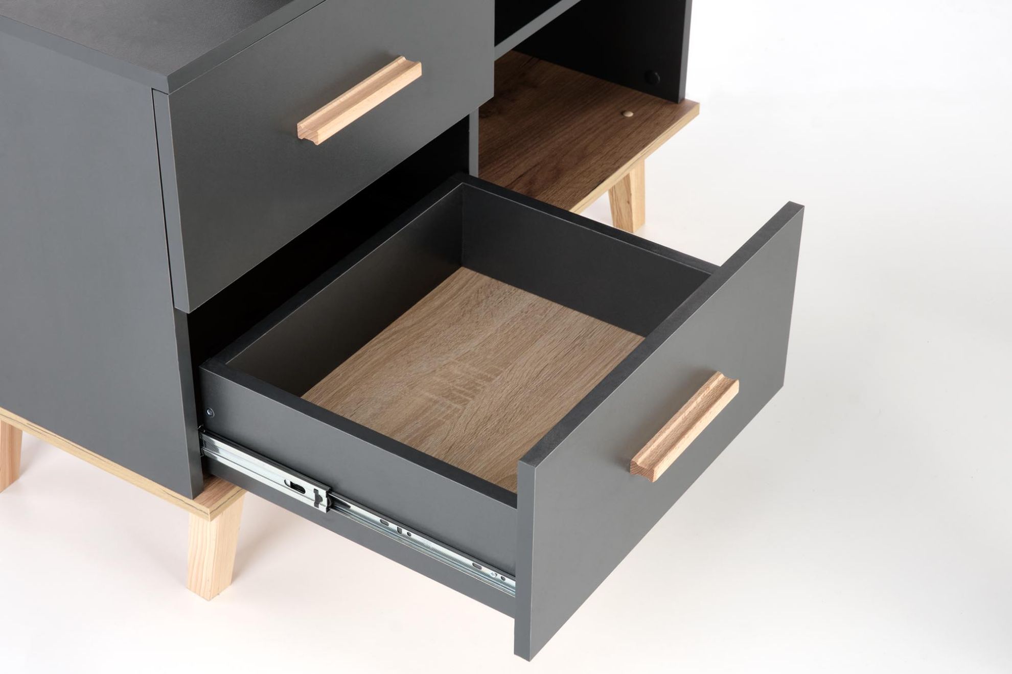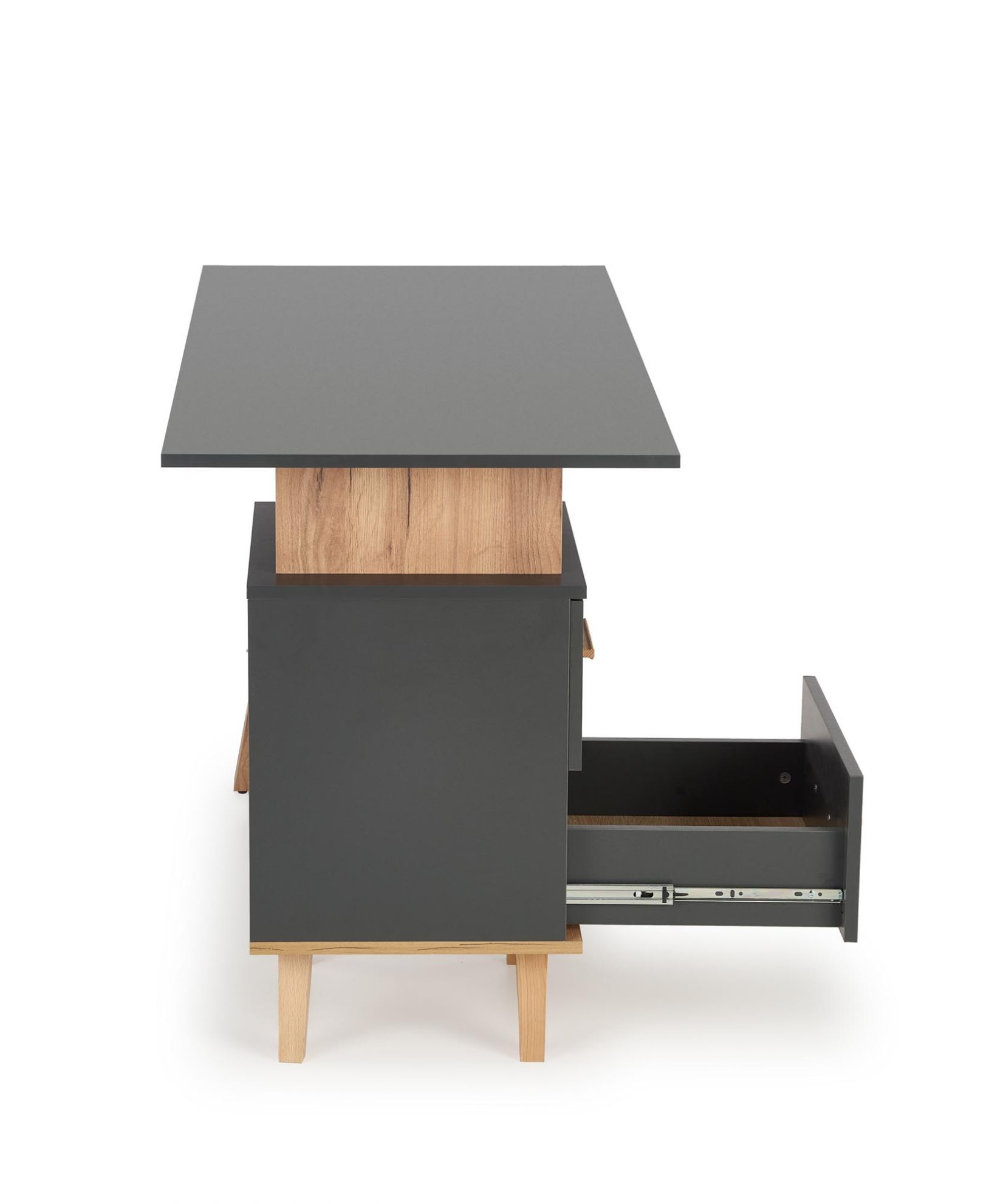 Konstrukcja biurka opiera się na wysokiej jakości materiałach, w tym płycie meblowej okleinowanej, MDF okleinowany i drewno lite. Kolor antracytu mat nadaje meblowi nowoczesnego charakteru, jednocześnie podkreślając elegancję i solidność wykonania. Nogi w odcieniu dębu wotan dodają biurku naturalnego, ciepłego akcentu.