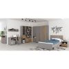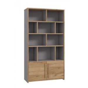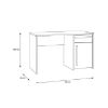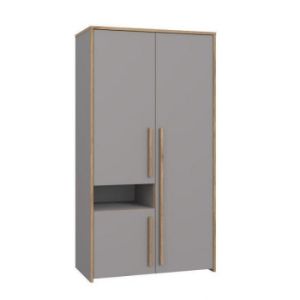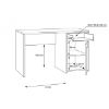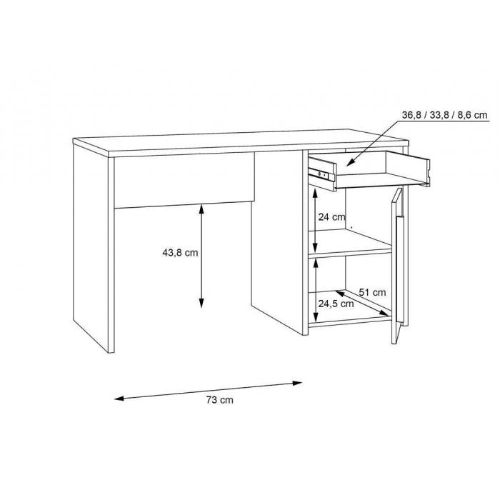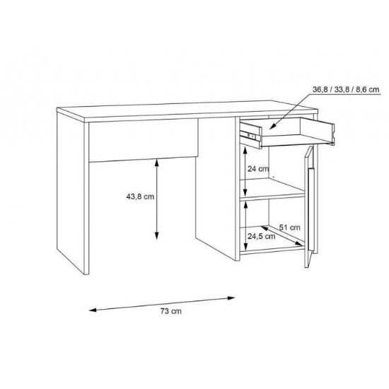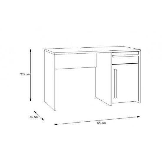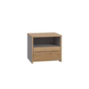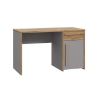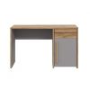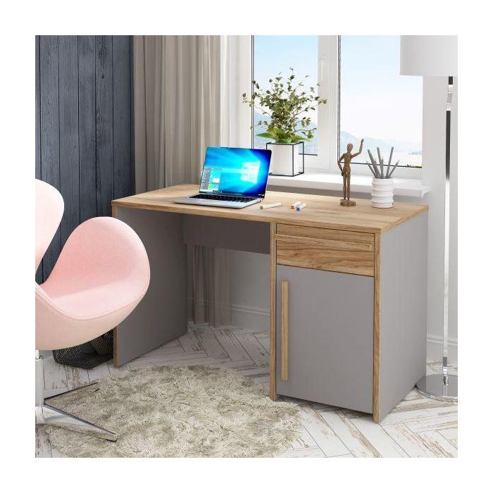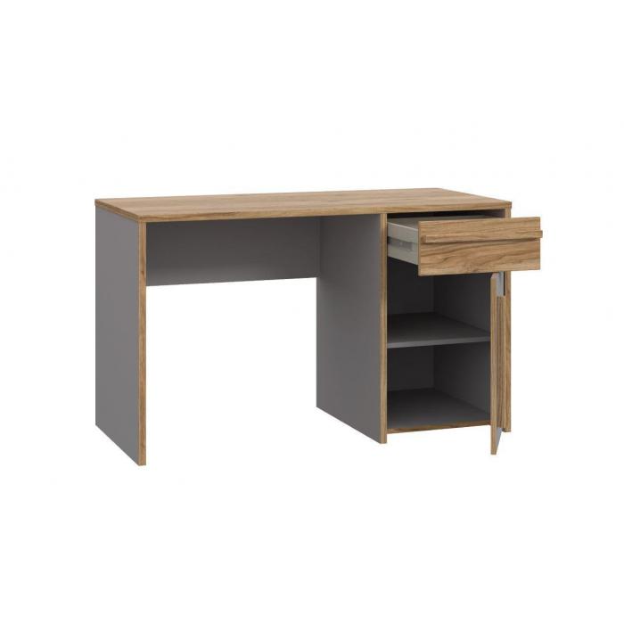 Korpus oraz front biurka Soklot wykonane zostały w szarym dekorze w połączeniu z dekorem dąb catania - wykończone folią finish + Folia PP. Biurko posiada jedną szufladę, za pojedynczymi drzwiami znajduje się dodatkowa półka. Maksymalne obciążenie półki wynosi 5 kg, szuflady 3 kg, górnego blatu 40 kg. Uchwyty wykonane z MDF-u w dekorze dąb catania.