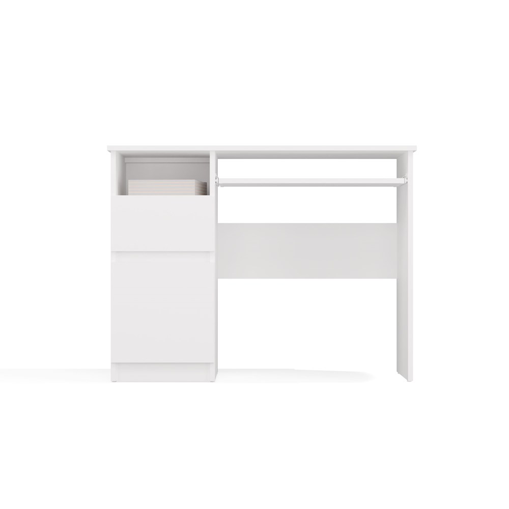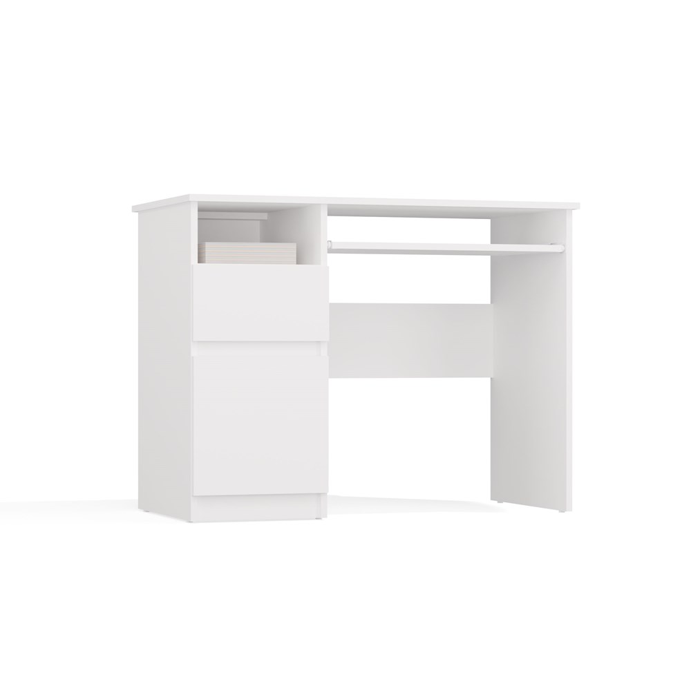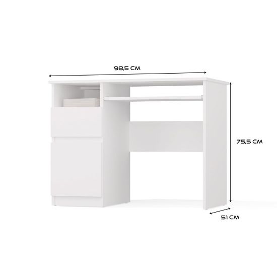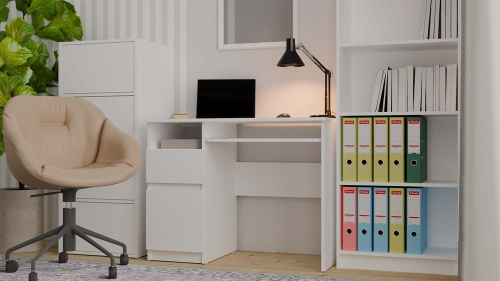Solidna budowa oparta na laminowanej płycie wiórowej o grubości 16 mm gwarantuje trwałość i odporność na codzienne użytkowanie. Szuflada zamontowana na prowadnicach rolkowych zapewnia płynne i bezpieczne otwieranie, zwiększając komfort pracy. Biurko Portos to połączenie nowoczesnego stylu i funkcjonalności, które uczyni każdą przestrzeń bardziej praktyczną i estetyczną.