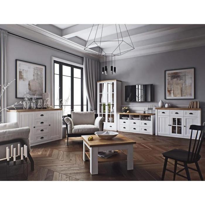 Kolekcja Prowansja oferuje różnorodność funkcjonalnych elementów, pozwalając dostosować wnętrze pokoju dziennego do indywidualnych potrzeb. Wielodrzwiowe i wieloszufladowe komody oraz szafy zapewniają nie tylko mnóstwo przestrzeni do przechowywania, ale także umożliwiają utrzymanie porządku w pomieszczeniu. Dzięki drążkom i półkom na ubrania wewnątrz szaf, organizacja garderoby staje się prostsza niż kiedykolwiek. Szafka RTV doskonale komponuje się z nowoczesnymi telewizorami, zapewniając jednocześnie miejsce na przechowywanie różnych urządzeń multimedialnych. Pojemne witryny z przeszklonymi drzwiami stanowią idealne miejsce do eksponowania dekoracji lub cennych pamiątek, nadając wnętrzu subtelny akcent elegancji. Pólki, ławy i krzesła, które również znajdują się w kolekcji Prowansja, pozwalają na tworzenie przytulnych aranżacji w każdym detalu. Ich minimalistyczny design doskonale współgra z całością, zapewniając zarazem wygodę i stylowe wykończenie przestrzeni.