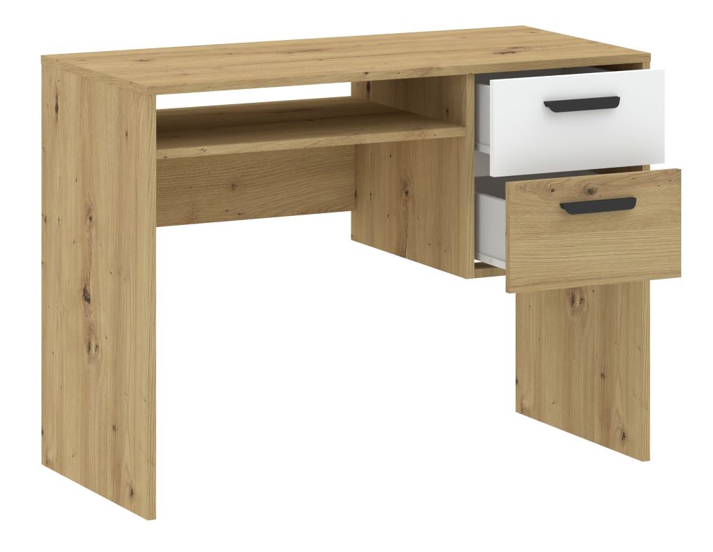 Biurko Basic Two to idealne rozwiązanie do domowego biura, pokoju młodzieżowego czy przestrzeni do nauki. Połączenie dekoru dąb artisan z matowymi białymi frontami nadaje mu nowoczesny i elegancki wygląd, który doskonale wpisuje się w różne aranżacje wnętrz.