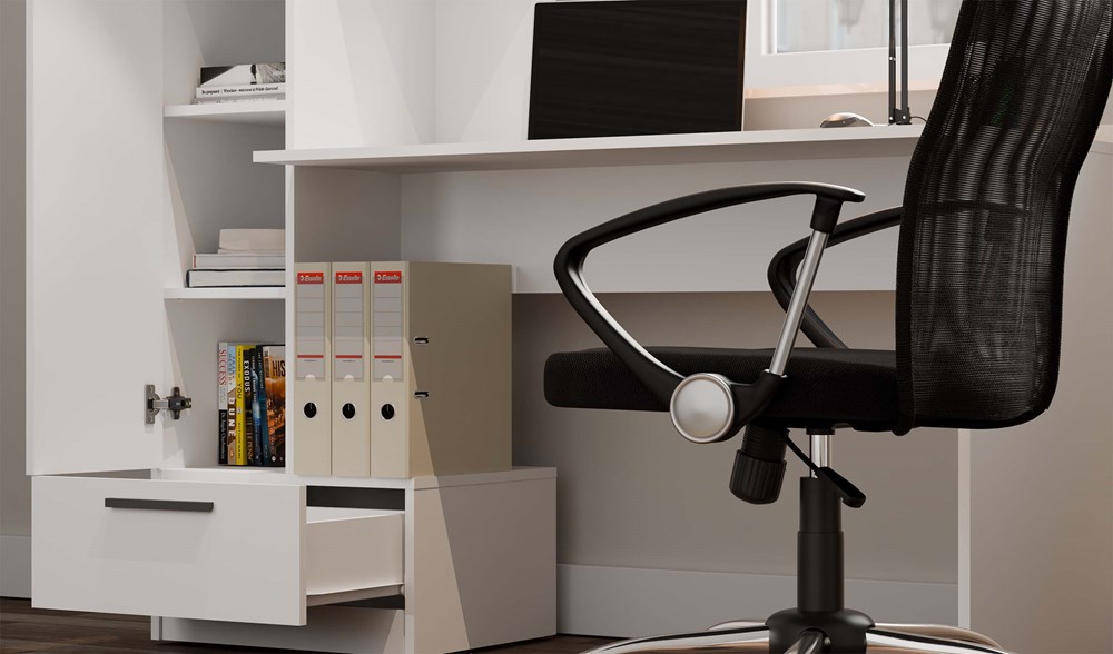 Zintegrowany regał Biurka Osmo zawiera część zamykaną drzwiami, oferując trzy pojemne półki na dokumenty i inne niezbędne akcesoria. Dodatkowo, otwarte półki zapewniają łatwy dostęp do najczęściej używanych przedmiotów, co zwiększa efektywność pracy.