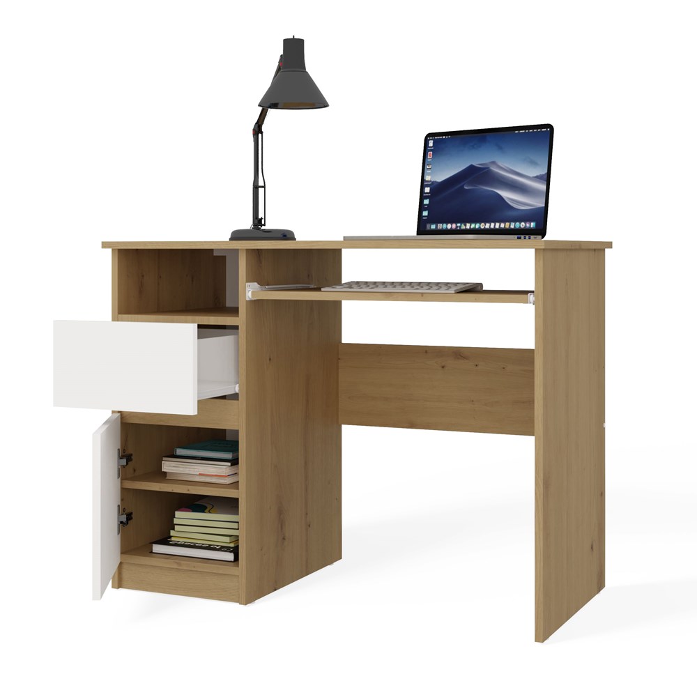 Biurko z szufladą Portos lewe dąb artisan/biały to propozycja dla osób, które poszukują praktycznego i estetycznego mebla do codziennej pracy, nauki lub home office. Połączenie ciepłego dekoru dąb artisan z matową bielą sprawia, że biurko doskonale wpisuje się w aktualne trendy aranżacyjne, jednocześnie pozostając uniwersalne i łatwe do dopasowania do różnych wnętrz. Ten model sprawdzi się zarówno w pokoju młodzieżowym, jak i w nowoczesnym gabinecie czy niewielkim biurze firmowym. Przemyślana konstrukcja pozwala na wygodną organizację przestrzeni roboczej, co ma ogromne znaczenie przy wielogodzinnej pracy przy komputerze.