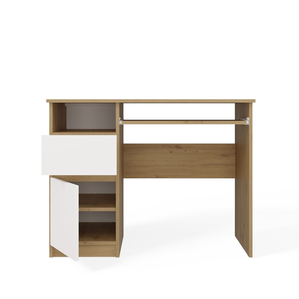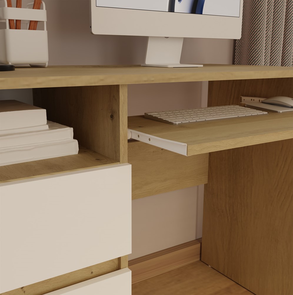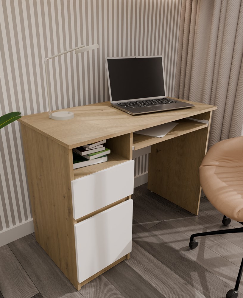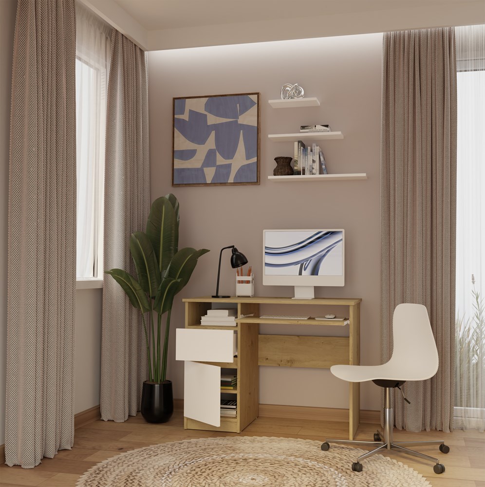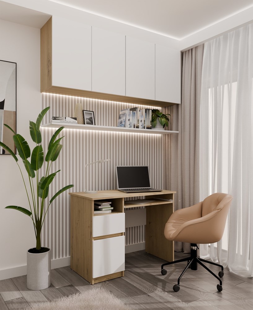 Kolorystyka biurka to starannie dobrany mix bieli matowej i dekoru dąb artisan. Korpus w odcieniu dąb artisan nadaje meblowi naturalny i przytulny wygląd, natomiast białe fronty bez uchwytów podkreślają nowoczesny charakter bryły. Gładkie powierzchnie oraz minimalistyczna forma sprawiają, że biurko do pokoju i biura prezentuje się lekko i nie przytłacza aranżacji, nawet w niewielkich wnętrzach. To idealny wybór do przestrzeni urządzonych w stylu nowoczesnym, skandynawskim lub loftowym.