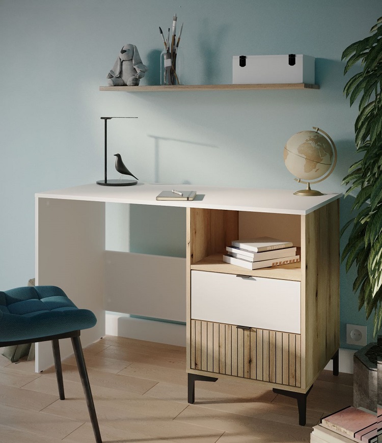 Biurko Ricko 2S RIKB01 to funkcjonalny mebel stworzony z myślą o codziennej pracy i nauce. Dzięki solidnej konstrukcji z płyty wiórowej laminowanej, biurko łączy trwałość z nowoczesnym wyglądem. Model wyposażono w dwie pojemne szuflady na prowadnicach kulkowych z pełnym wysuwem, co umożliwia wygodne przechowywanie dokumentów, przyborów biurowych i akcesoriów szkolnych.