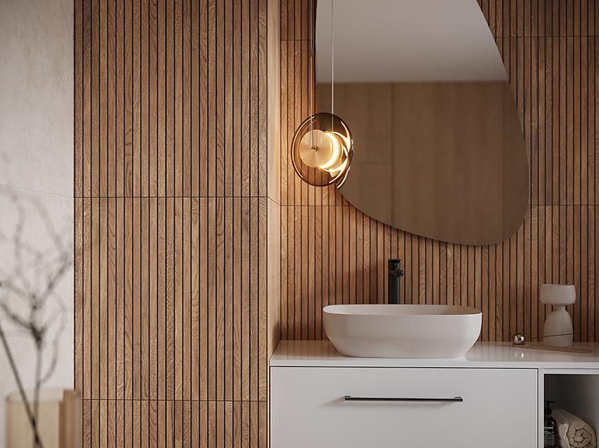 Powierzchnia matowa jest tu w pełni logiczna — drewnopodobne wzornictwo w wydaniu matowym zawsze daje efekt bliższy naturalnej percepcji. W naturze drewno nie świeci. Mat skraca dystans między naturalnym materiałem a jego interpretacją. Struktura dodatkowo wzmacnia realizm — światło odbiera ją jako fakturę, a nie jako płaską grafikę. To szczególnie istotne w płytkach, które nie mają być jedynie ilustracją drewna, ale jego wizualną i materialną analogią.