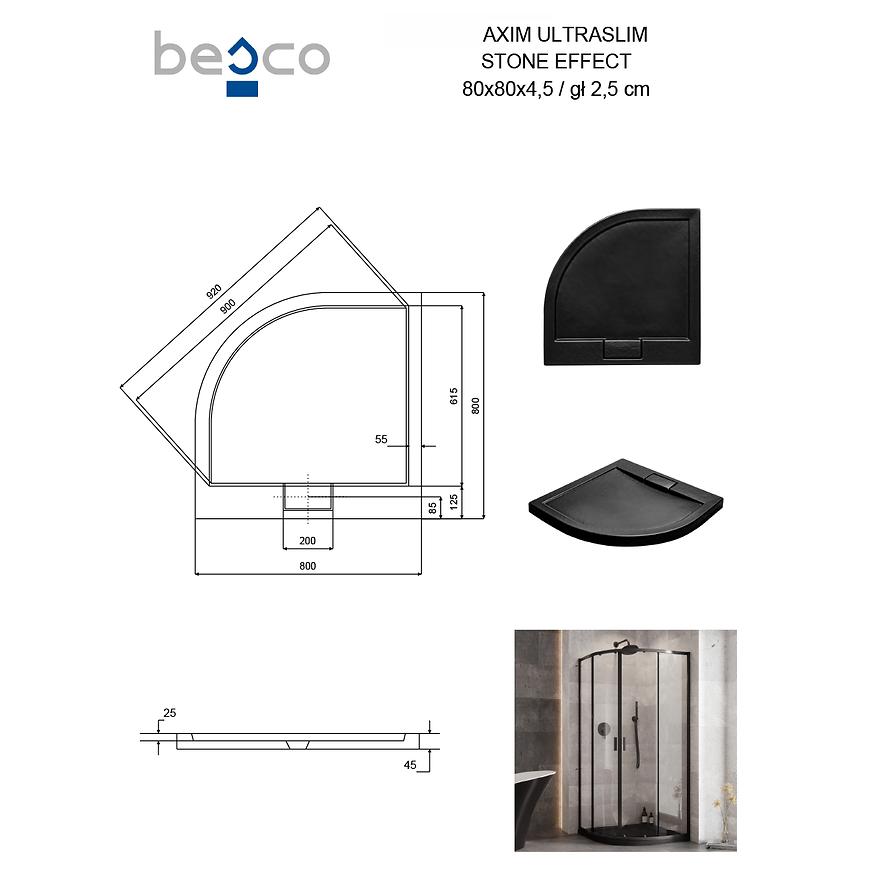 Elegancki brodzik półokrągły Axim Ultraslim Stone Effect 80x80 cm w czarnym wykończeniu marki BESCO to idealne połączenie nowoczesnego designu i funkcjonalności. Wykonany z trwałego akrylu sanitarnego, zapewnia odporność i łatwe utrzymanie czystości. Niski profil – 4,5 cm wysokości, głębokość 2,5 cm – gwarantuje komfort i bezpieczeństwo podczas codziennego użytkowania. Syfon w komplecie i lekka konstrukcja o wadze 12,5 kg ułatwiają montaż. Stylowy Stone Effect oraz zaokrąglony kształt z promieniem R55 wprowadzą do łazienki elegancję i nowoczesny charakter, idealny do każdej przestrzeni prysznicowej.