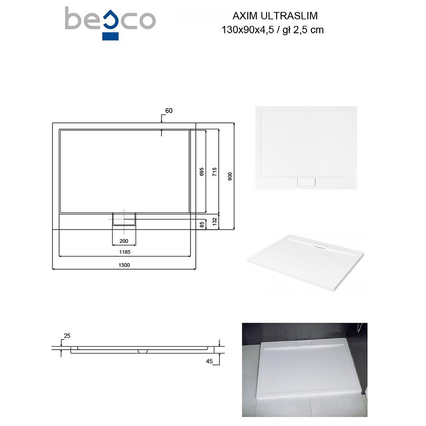 Brodzik prostokątny Axim Ultraslim 130×90 cm marki BESCO to eleganckie i funkcjonalne rozwiązanie do nowoczesnych łazienek. Wykonany z wysokiej jakości akrylu sanitarnego w klasycznym białym kolorze, charakteryzuje się gładką powierzchnią, trwałością i łatwością czyszczenia. Niska wysokość 4,5 cm oraz głębokość 2,5 cm zapewniają wygodny dostęp do kabiny prysznicowej, a waga 19 kg gwarantuje stabilność. W komplecie znajduje się syfon, co ułatwia szybki i bezproblemowy montaż. Idealny wybór do prostokątnych kabin prysznicowych.