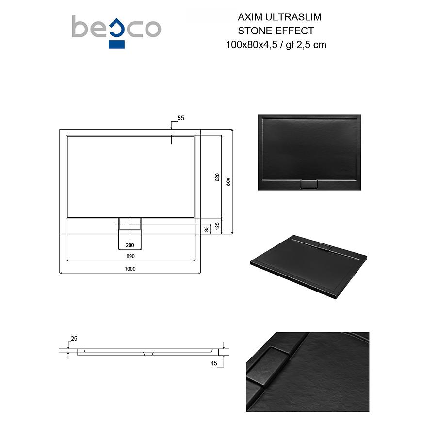 Brodzik prostokątny Axim Ultraslim Stone Effect New 100×80 cm marki BESCO to eleganckie i nowoczesne rozwiązanie do stylowej łazienki. Wykonany z trwałego akrylu sanitarnego w efektownym czarnym wykończeniu stone effect, łączy wysoką estetykę z odpornością na codzienne użytkowanie. Ultracienka konstrukcja o wysokości 4,5 cm i głębokości 2,5 cm zapewnia komfortowy dostęp, a solidna waga 15 kg gwarantuje stabilność. W komplecie znajduje się syfon, co ułatwia montaż i skraca czas instalacji. Idealny do kabin prostokątnych.