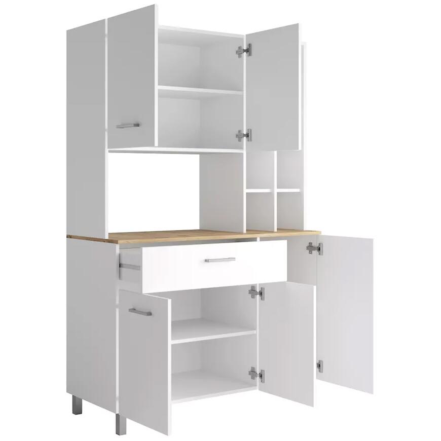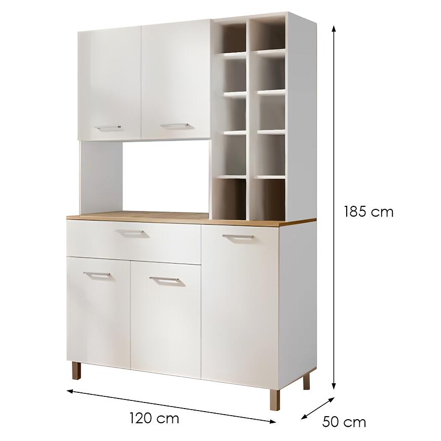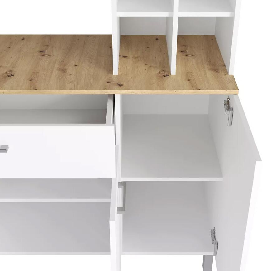 Bufet Italy w nowoczesnym stylu to eleganckie połączenie białego, matowego frontu z ciepłym blatem w kolorze dąb artisan, które wnosi do wnętrza poczucie harmonii i funkcjonalności. Ten kilkudrzwiowy mebel został zaprojektowany z myślą o maksymalnej praktyczności – posiada dziesięć przestronnych półek oraz jedną wygodną szufladę, umożliwiającą estetyczne przechowywanie różnorodnych przedmiotów. Wykonany z wysokiej jakości płyty wiórowej laminowanej, bufet Italy gwarantuje trwałość i łatwość w utrzymaniu czystości, zachowując przy tym nowoczesny charakter wnętrza. Mebel o szerokości 120 cm i wysokości 185 cm doskonale sprawdzi się zarówno w salonie, jadalni, jak i w przestronnej kuchni, dodając wnętrzu elegancji i porządku.
