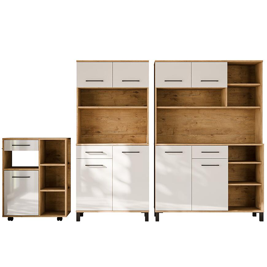 Fronty wykonano z laminowanej płyty wiórowej w połysku, a korpus z matowej laminowanej płyty wiórowej, co gwarantuje trwałość i stabilność mebla. Połączenie bieli z ciepłym dębem lancelot tworzy atrakcyjny kontrast i wprowadza nowoczesny akcent do wnętrza.