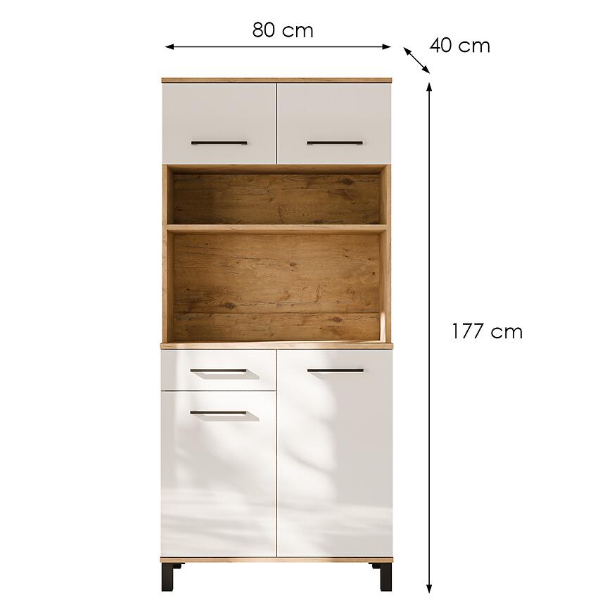 Kredens wyposażono w jedną półkę i jedną szufladę, a kilkudrzwiowa konstrukcja pozwala na wygodne przechowywanie naczyń, dokumentów lub dekoracji. Wymiary mebla – szerokość 80 cm, wysokość 177 cm i głębokość 40 cm – zapewniają kompaktowe proporcje, dzięki czemu kredens sprawdzi się w różnych pomieszczeniach, oferując jednocześnie praktyczną przestrzeń do przechowywania.