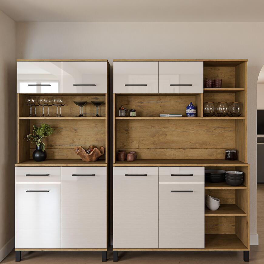 Fronty wykonano z laminowanej płyty wiórowej w połysku, a korpus z matowej laminowanej płyty wiórowej, co gwarantuje stabilność i trwałość mebla. Połączenie bieli z ciepłym dębem lancelot tworzy atrakcyjny kontrast i wprowadza nowoczesny akcent do wnętrza, podkreślając elegancję całego pomieszczenia.
