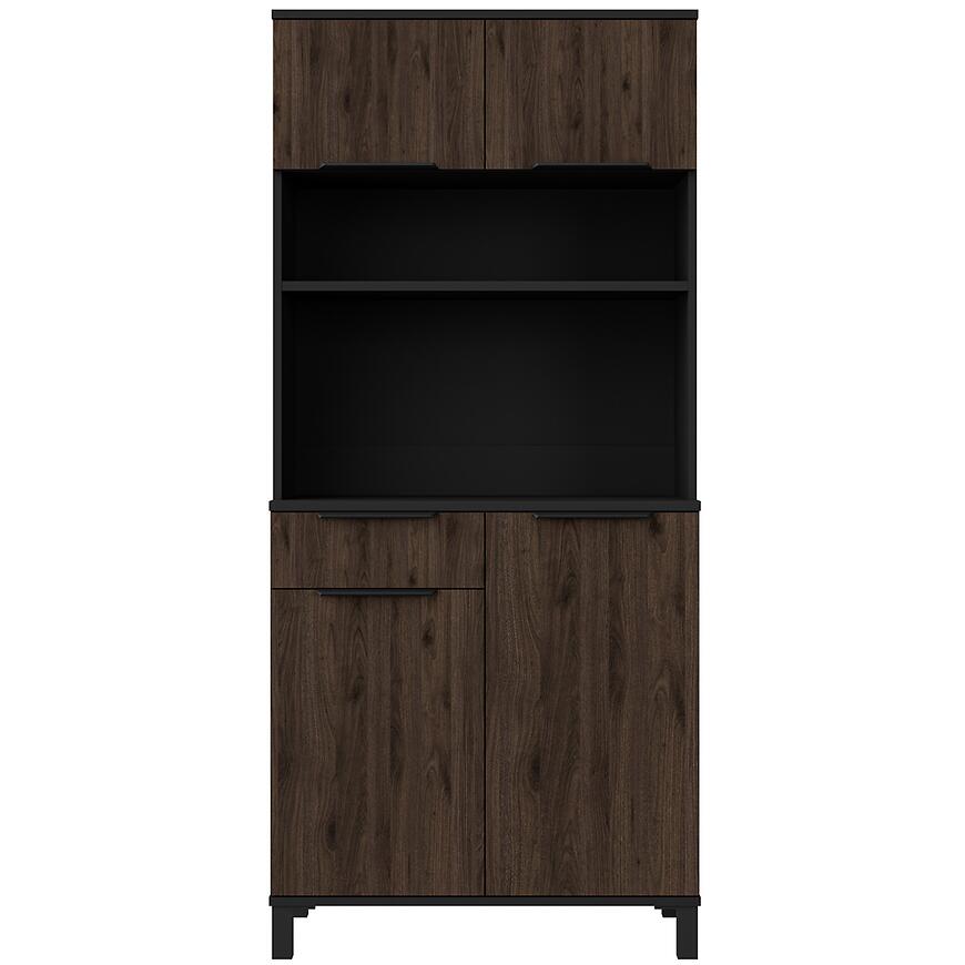 Kredens Linda Orzech Okapi 80 (MONZA) łączy nowoczesny design z praktycznymi rozwiązaniami. Ciemne drewnopodobne wybarwienie frontów w połączeniu z czarnym, matowym korpusem nadaje meblowi elegancki i stylowy charakter. Model doskonale pasuje do wnętrz urządzonych w stylu nowoczesnym, loftowym lub minimalistycznym.