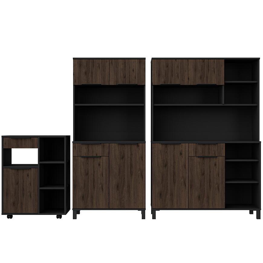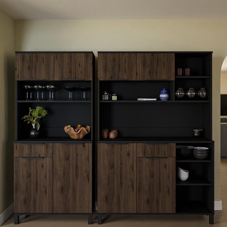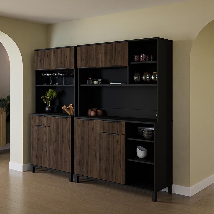 Fronty i korpus wykonano z laminowanej płyty wiórowej, co zapewnia stabilność i trwałość mebla. Matowe wykończenie podkreśla nowoczesny charakter kredensu i ułatwia utrzymanie czystości. Połączenie ciemnego drewna z czarnym korpusem wprowadza elegancki kontrast i dodaje wnętrzu wyrafinowanego wyglądu.