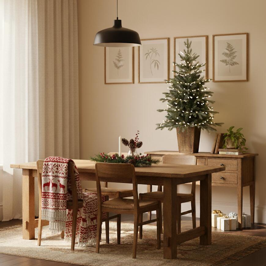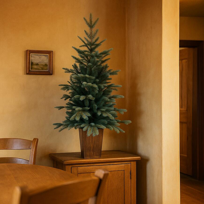 Choinka na pniu o wysokości 120 cm to idealne rozwiązanie dla osób ceniących eleganckie i naturalne dekoracje świąteczne. Osadzona na stabilnym, drewnianym pniu prezentuje się niezwykle efektownie, dodając wnętrzu przytulnego, leśnego klimatu. Dzięki kompaktowym wymiarom doskonale sprawdzi się zarówno w salonie, biurze, jak i mniejszych pomieszczeniach, wprowadzając wyjątkową atmosferę świąt Bożego Narodzenia. To stylowa alternatywa dla tradycyjnych drzewek, łącząca prostotę z nowoczesnym designem.