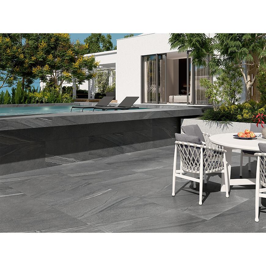 Płytka Cutstone Graphite Espesorado 60x90x2 cm Anti-Slip z kolekcji CUTSTONE łączy nowoczesny design z wysoką trwałością. Jest idealna do przestrzeni zewnętrznych i wewnętrznych, takich jak tarasy, balkony, ogrody czy przestrzenie komercyjne, nadając powierzchni elegancki i naturalny wygląd kamienia.