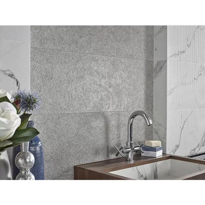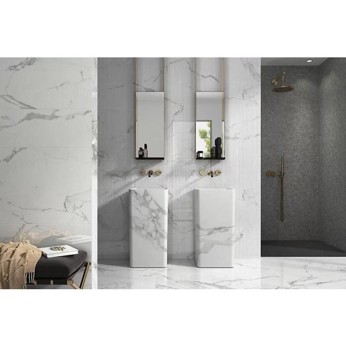 Glazura Enzo wyróżnia się eleganckim połyskiem, który sprawia, że światło odbija się od powierzchni, nadając ścianie lekkości i jasności. Zastosowane wzornictwo imitujące marmur prezentuje delikatny, naturalny układ żył, wprowadzając subtelną dekoracyjność bez nadmiaru ozdobników. To rozwiązanie szczególnie cenione w aranżacjach utrzymanych w nowoczesnej, minimalistycznej stylistyce.