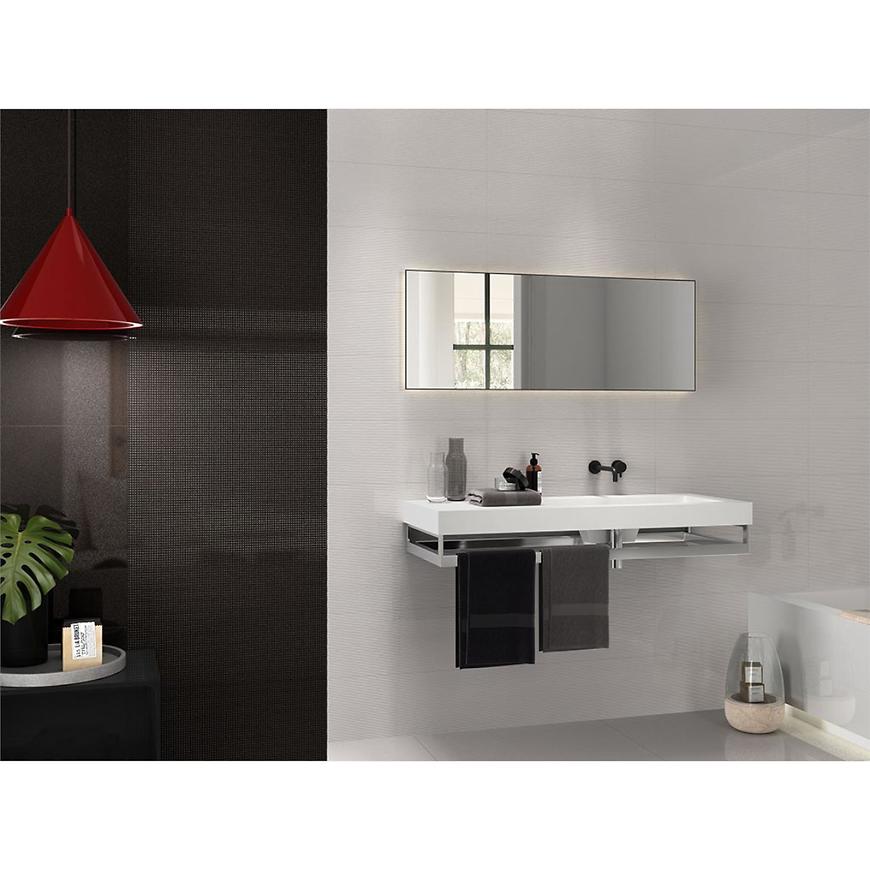 Rektyfikacja pozwala zastosować wąską fugę, co przy czerni ma znaczenie absolutnie kluczowe – cienka linia łączenia potrafi całkowicie zmienić odbiór ściany. Format 25/75 jest skalą dopasowaną do minimalistycznej architektury i pozwala na świadomą pracę kompozycyjną.