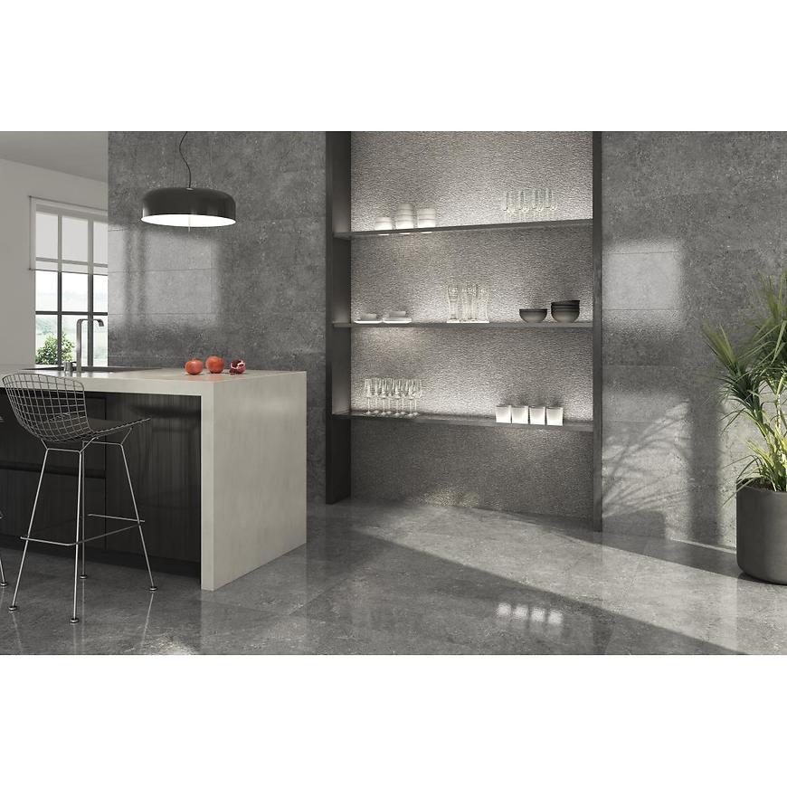 Imitacja kamienia jest subtelna, z delikatnymi niuansami i żyłkami, dzięki czemu powierzchnia wygląda naturalnie i prestiżowo. Połysk nadaje płytce lekkości i sprawia, że ściana subtelnie odbija światło, podkreślając głębię grafitowego koloru i dodając wnętrzu elegancji.