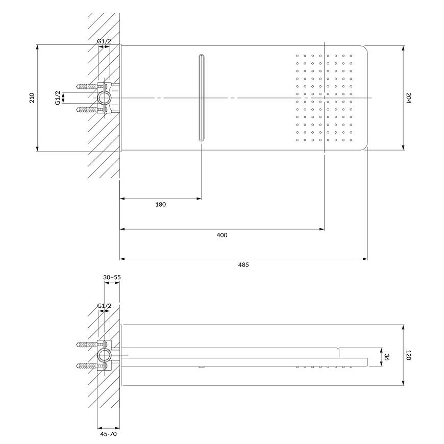 Nowoczesna deszczownica o wymiarach 48,5x20,4 cm w eleganckim chromowanym wykończeniu. Zapewnia szeroki, relaksujący strumień wody typu wodospad – idealna do stylowych i komfortowych łazienek.