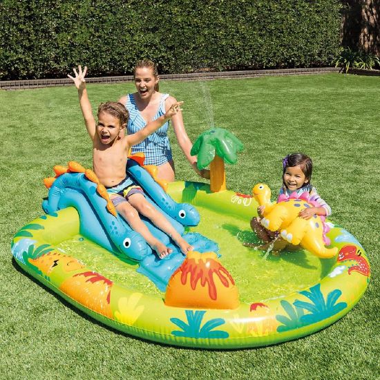 Kolorowa grafika i nadmuchiwany dinozaur sprawiają, że plac zabaw staje się wyjątkowym miejscem do wodnych harców.