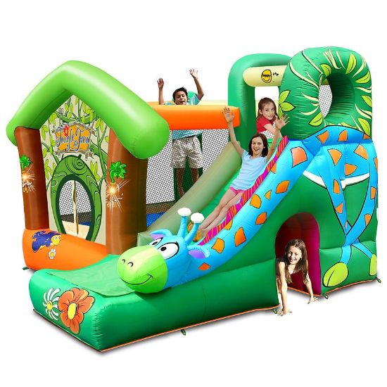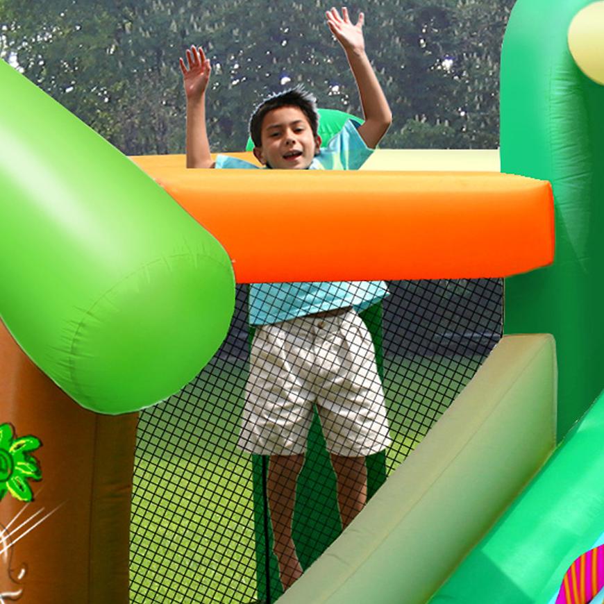 Dmuchany plac zabaw Żyrafa 350x340x245 cm to idealne miejsce do aktywnej i bezpiecznej zabawy na świeżym powietrzu. Zjeżdżalnia, trampolina, ścianka do wspinania oraz obręcz do rzutów gwarantują wiele godzin frajdy! Wykonany z trwałego PVC oraz podwójnie laminowanego nylonu, plac zabaw jest odporny na uszkodzenia i intensywne użytkowanie. Łatwy montaż i szybkie nadmuchiwanie sprawiają, że jest gotowy do użytku w zaledwie 60 sekund.