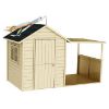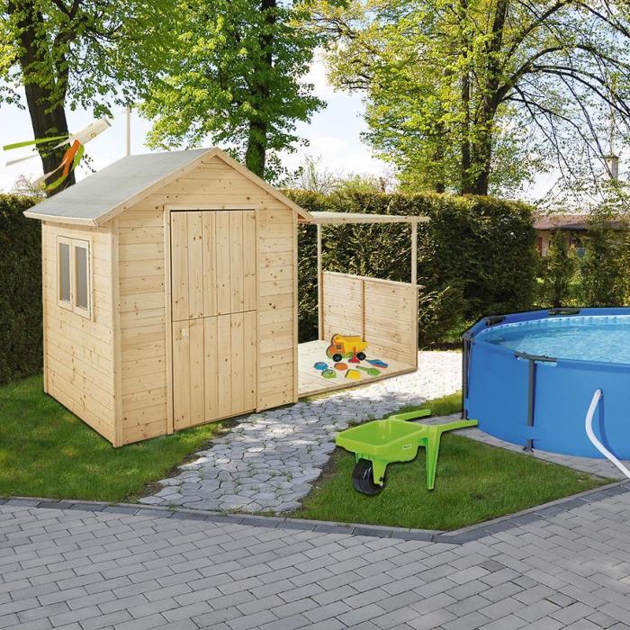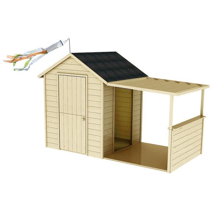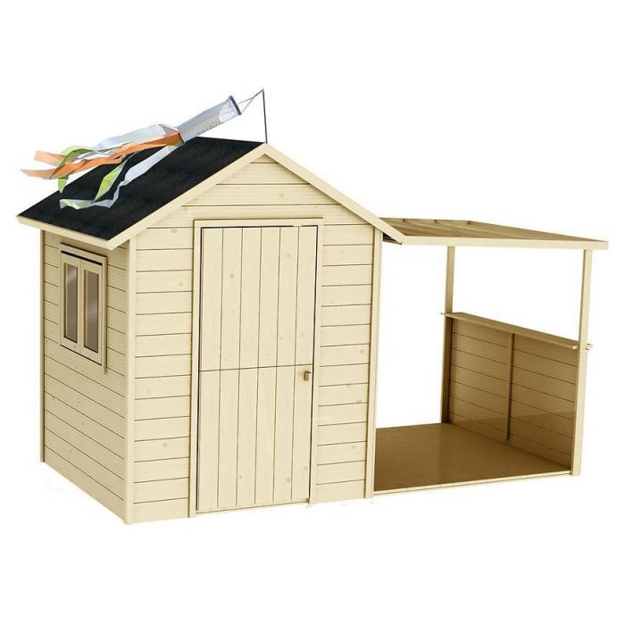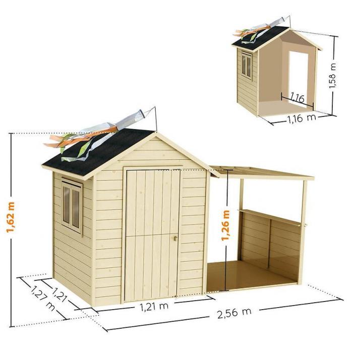 Domek dla dzieci Eugenie z tarasem to idealne miejsce zabaw. Domek przeznaczony jest nawet dla 4 dzieci w wieku 3-12 lat. Całość konstrukcji posiada podłogę o grubości 16mm. Do zestawu dołączona jest papa. Domek został wykonany ze strarannie wyselekcjonowanego, suszonego drewna. Nie jest impregnowany. Należy pomalować go bejcą lub lakierem do drewna. Wstępnie zmontowane ściany ułatwiają montaż. Domek posiada 1 otwierane okno, zamykane drzwi oraz otwarte przejście pomiędzy domkiem a tarasem. Nad tarasem zostały zamontowane deski, które zapewniają ochronę przed promieniami słonecznymi.