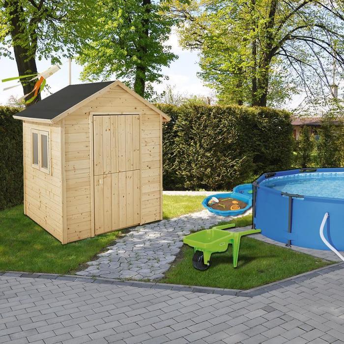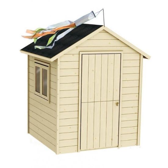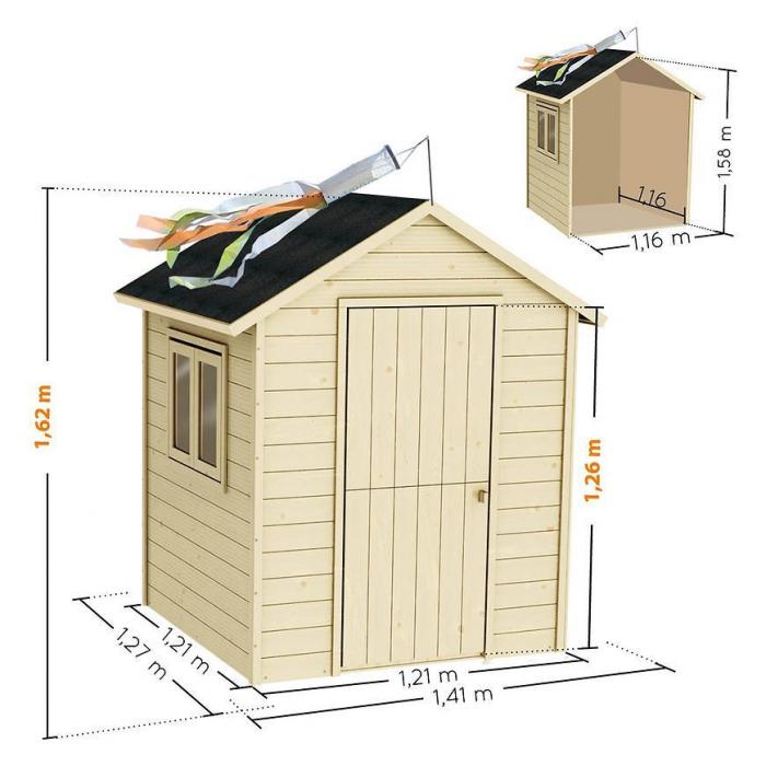 Całość konstrukcji posiada podłogę o grubości 16mm. Do zestawu dołączona jest papa bitumiczna. Domek został wykonany ze strarannie wyselekcjonowanego, suszonego drewna. Nie jest impregnowany. Należy pomalować go bejcą lub lakierem do drewna. Wstępnie zmontowane ściany ułatwiają montaż.