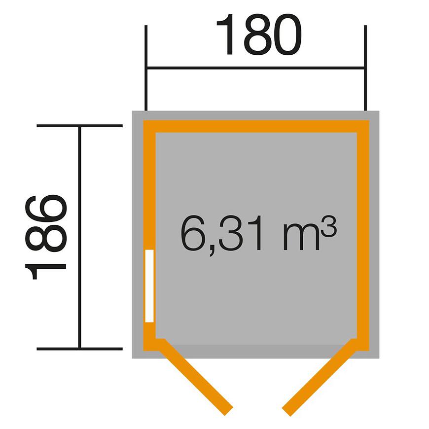 Wymiary: Szerokość 180 cm, głębokość 186 cm, wysokość 217 cm – powierzchnia użytkowa 3,06 m².