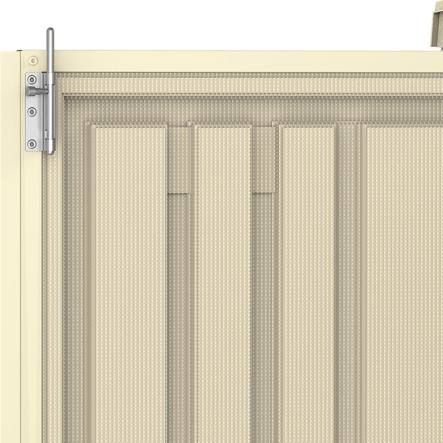 Metalowe wzmocnienie konstrukcji kolumn ściany zapewnia dużą wytrzymałość, umożliwiając zawieszenie półek lub narzędzi ogrodowych. Domek posiada podwójne drzwi, które są szerokie i wysokie, umożliwiając łatwe przechowywanie sprzętu nawet dla wysokich osób.